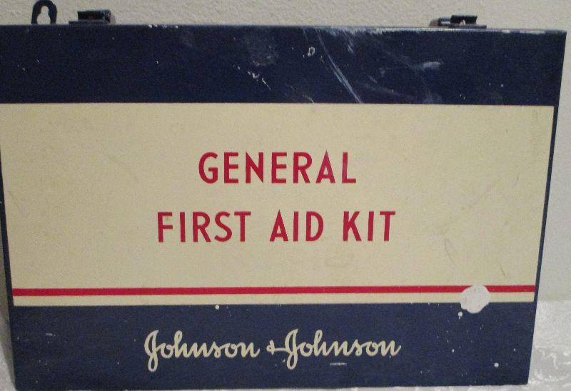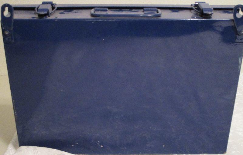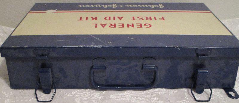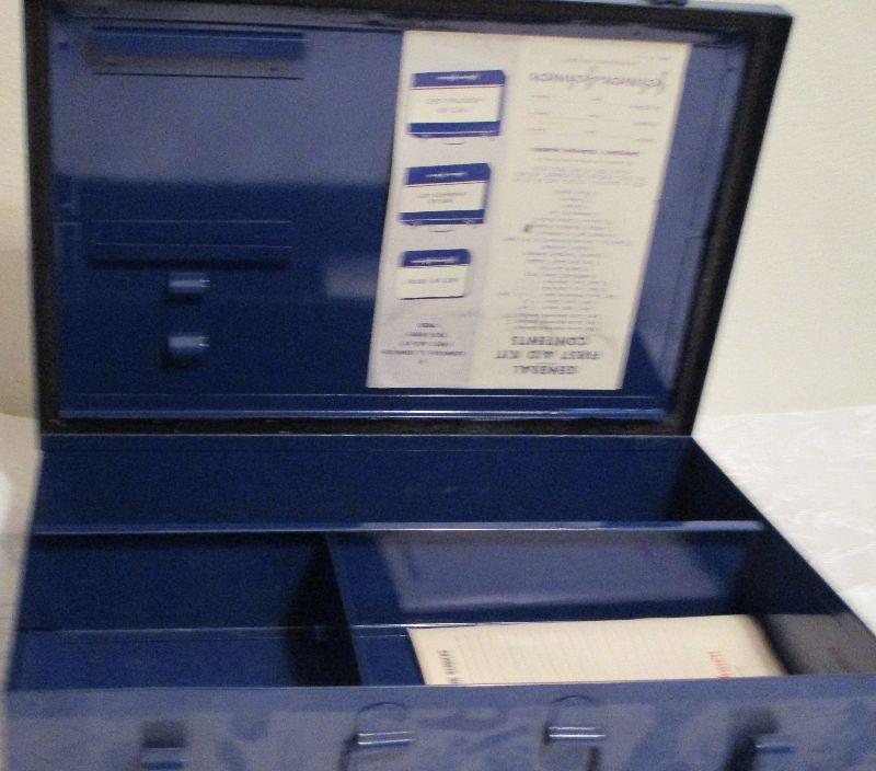 Empty metal box that would be great for building a first aid kit. It has a handle to carry and brackets to mount on the wall.