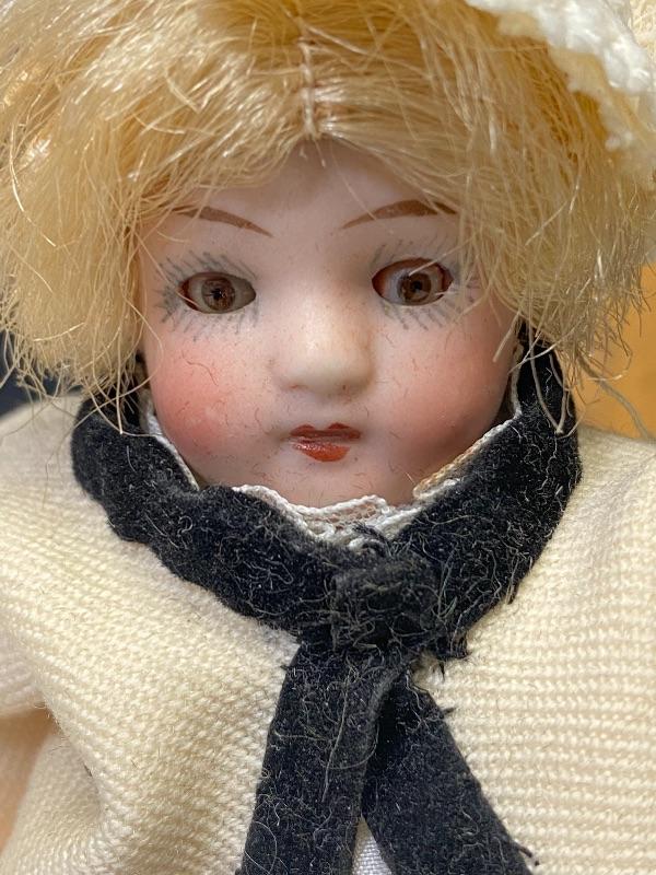 5" jointed bisque doll. Sleepy eyes, blonde wig has been glued down. Her head and body are one piece, jointed at the shoulders and hips. Faded face paint. Did not find any marks.