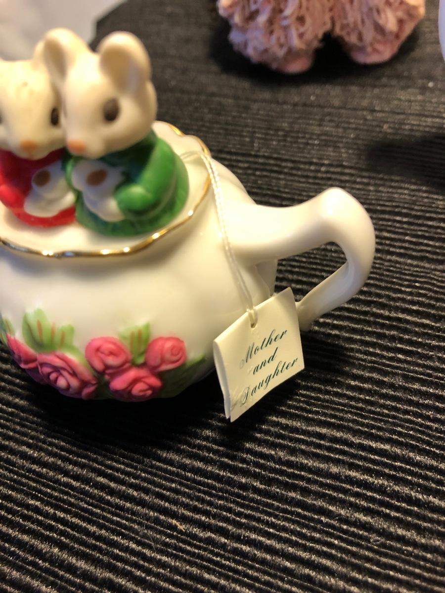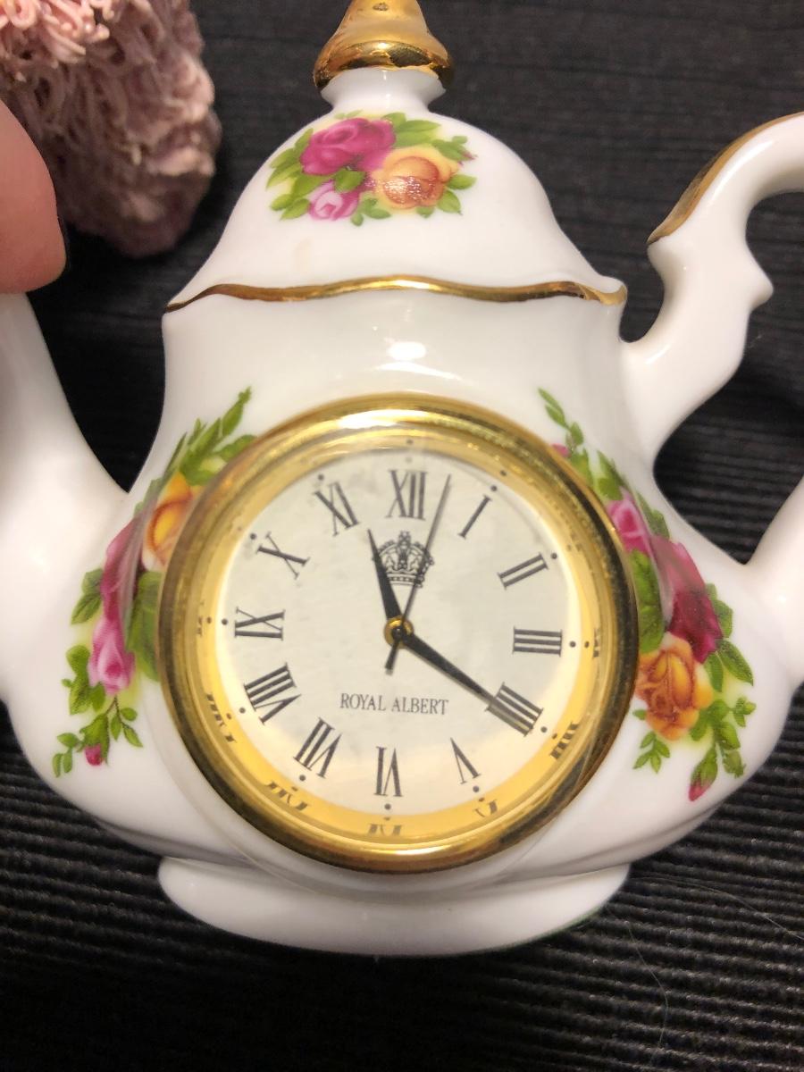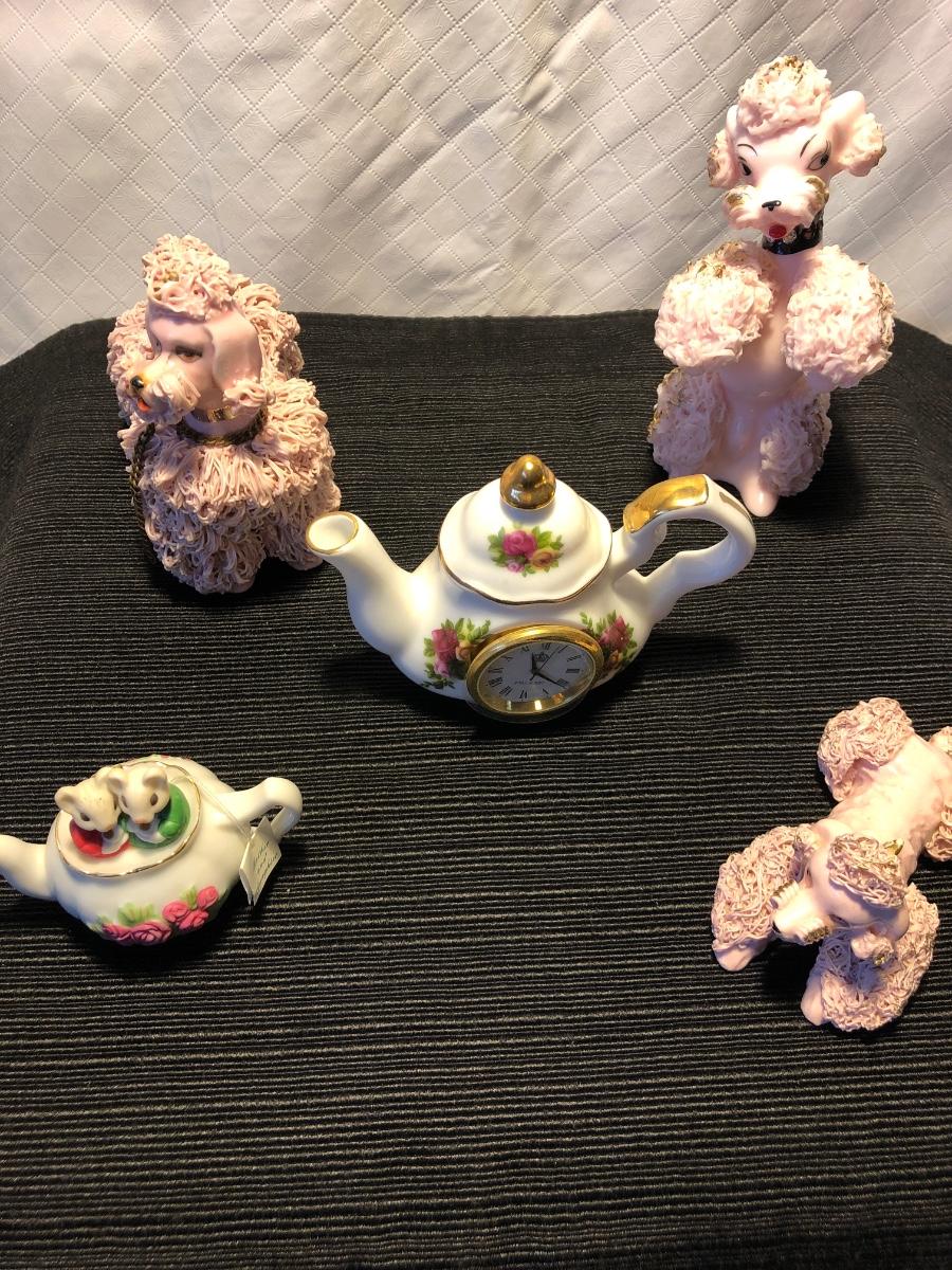 Unique poodle figurines & a mini teapot & the clock teapot is Royal Albert -not sure if clock works.
