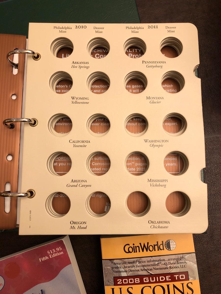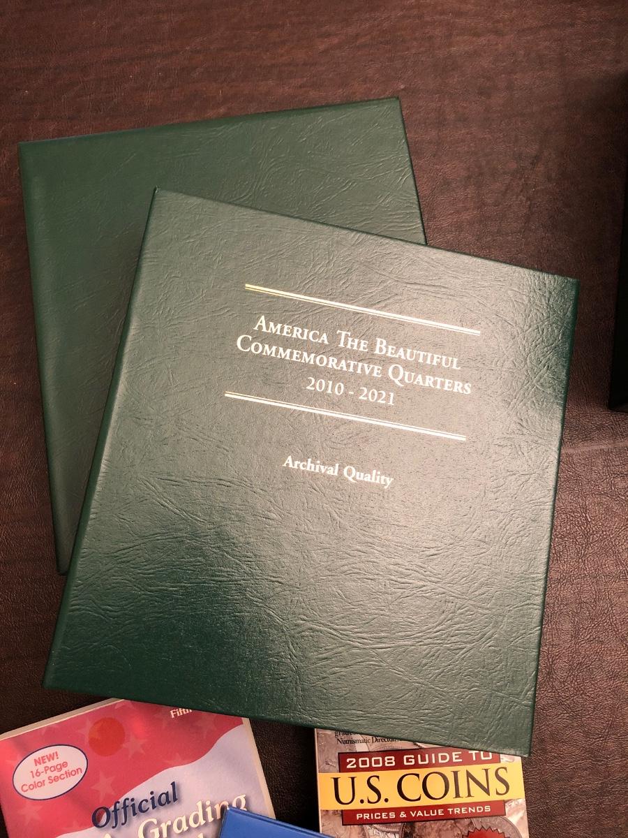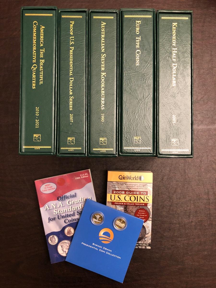 Archival quality Littleton coin albums with sleeves and anti-corrosion protection. Official ANA grading standards coin book. 2008 guide to US coins. Two "golden“ quarters. Barack Obama presidential coin collection in folder.