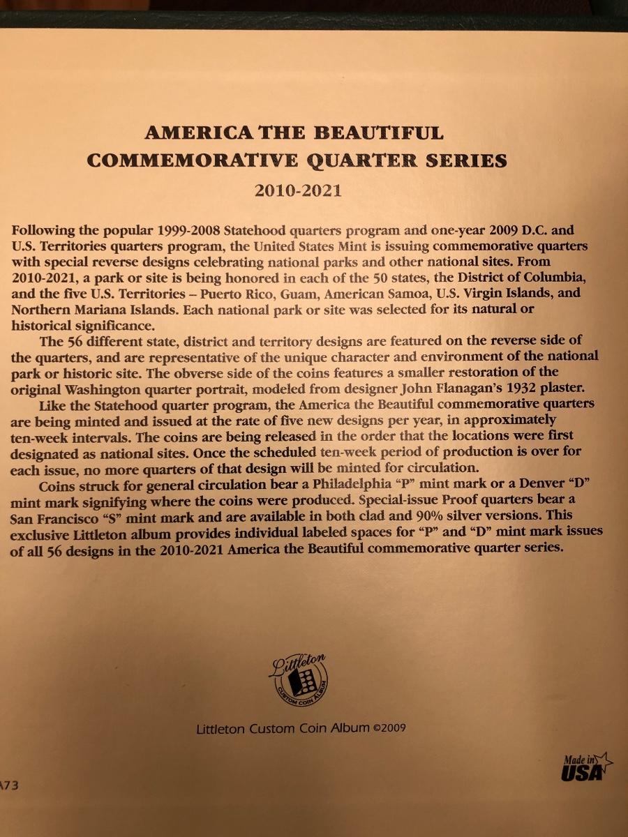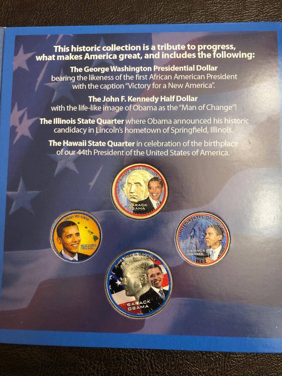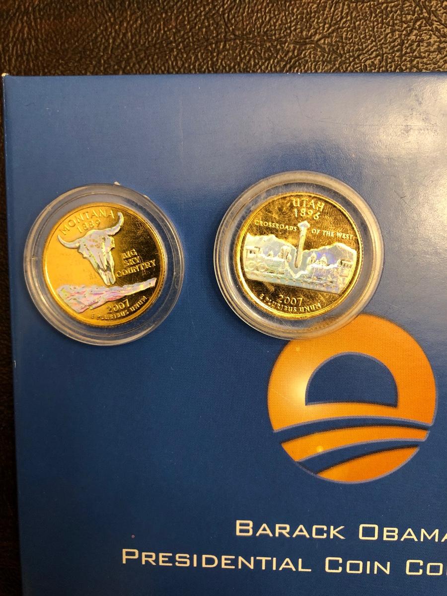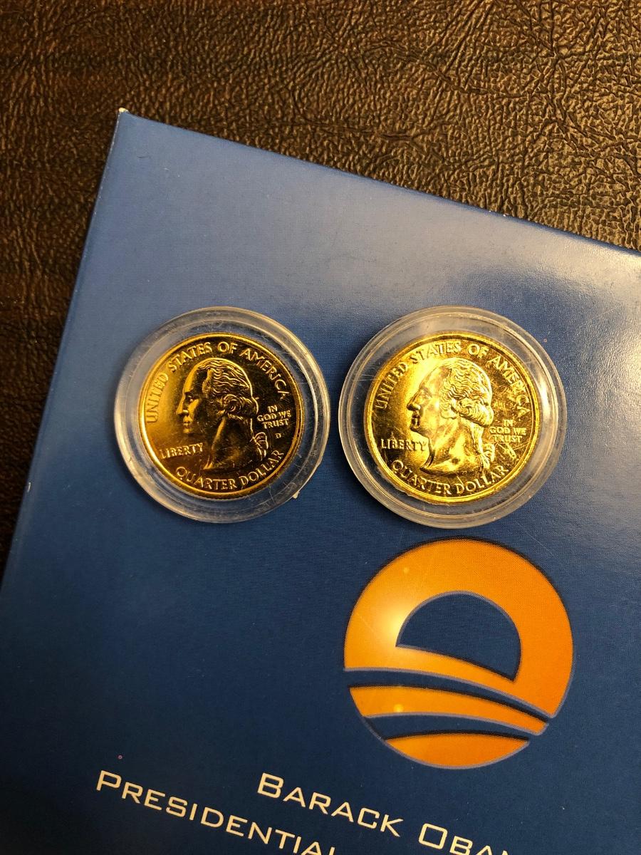 Archival quality Littleton coin albums with sleeves and anti-corrosion protection. Official ANA grading standards coin book. 2008 guide to US coins. Two "golden“ quarters. Barack Obama presidential coin collection in folder.