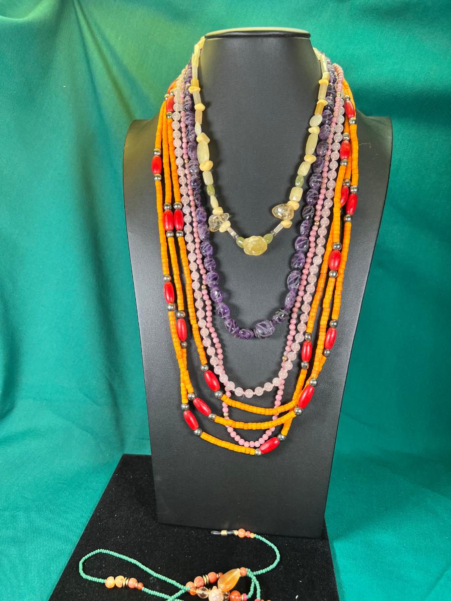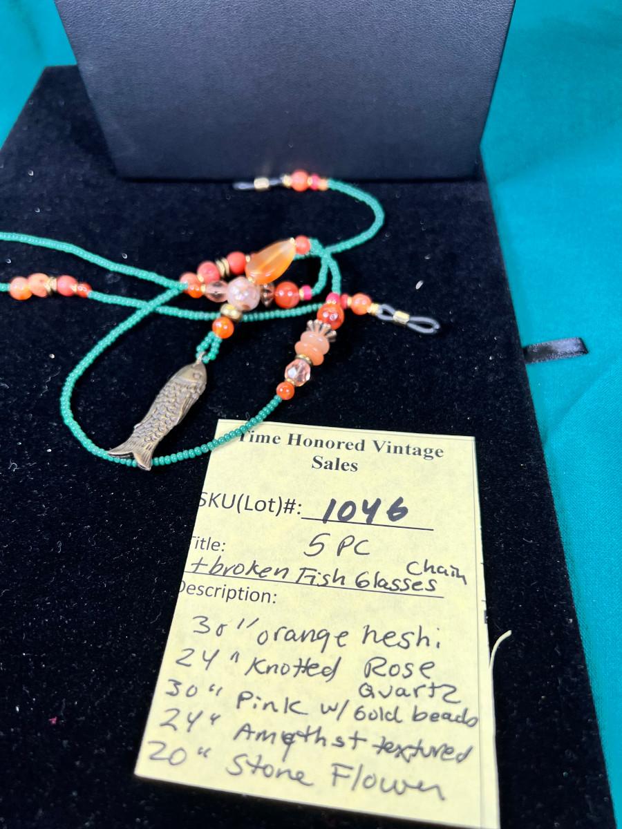 30" orange heshi, 24" Knotted Rose Quarts, 30" Pink with gold beads, 24" Textured Amethyst , 20" stone flower. A broken glasses chain with a fish bead is included for beads not in count.