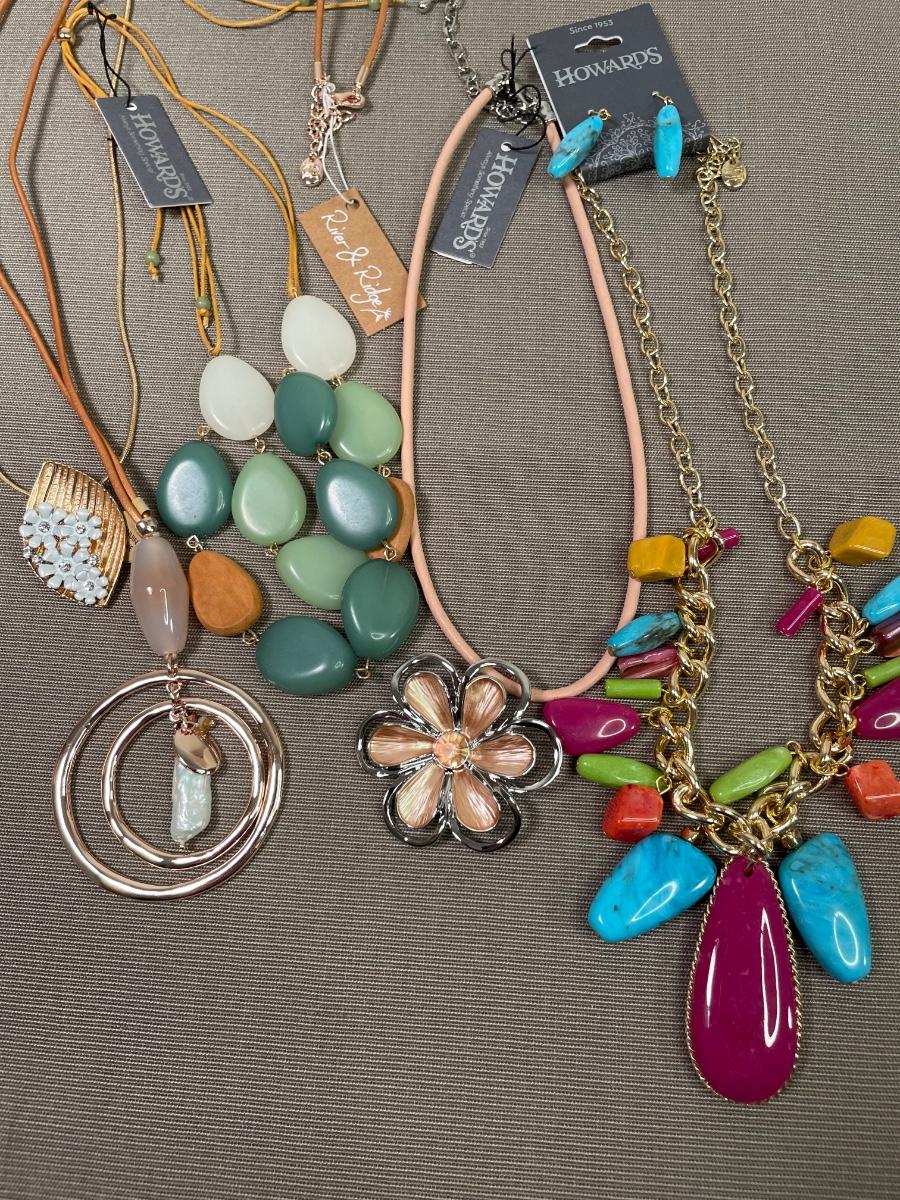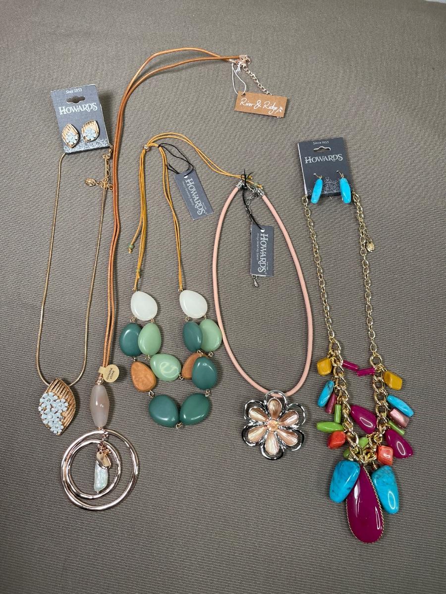 Howard’s Jewelry gold tone sets. Includes 5 necklaces and 2 pairs of earrings. Nice quality costume jewelry