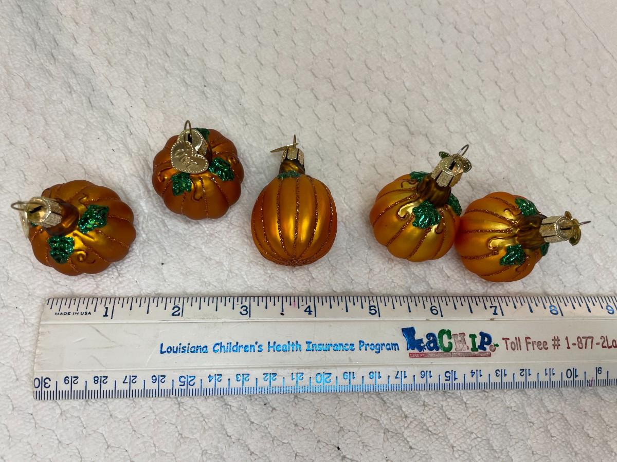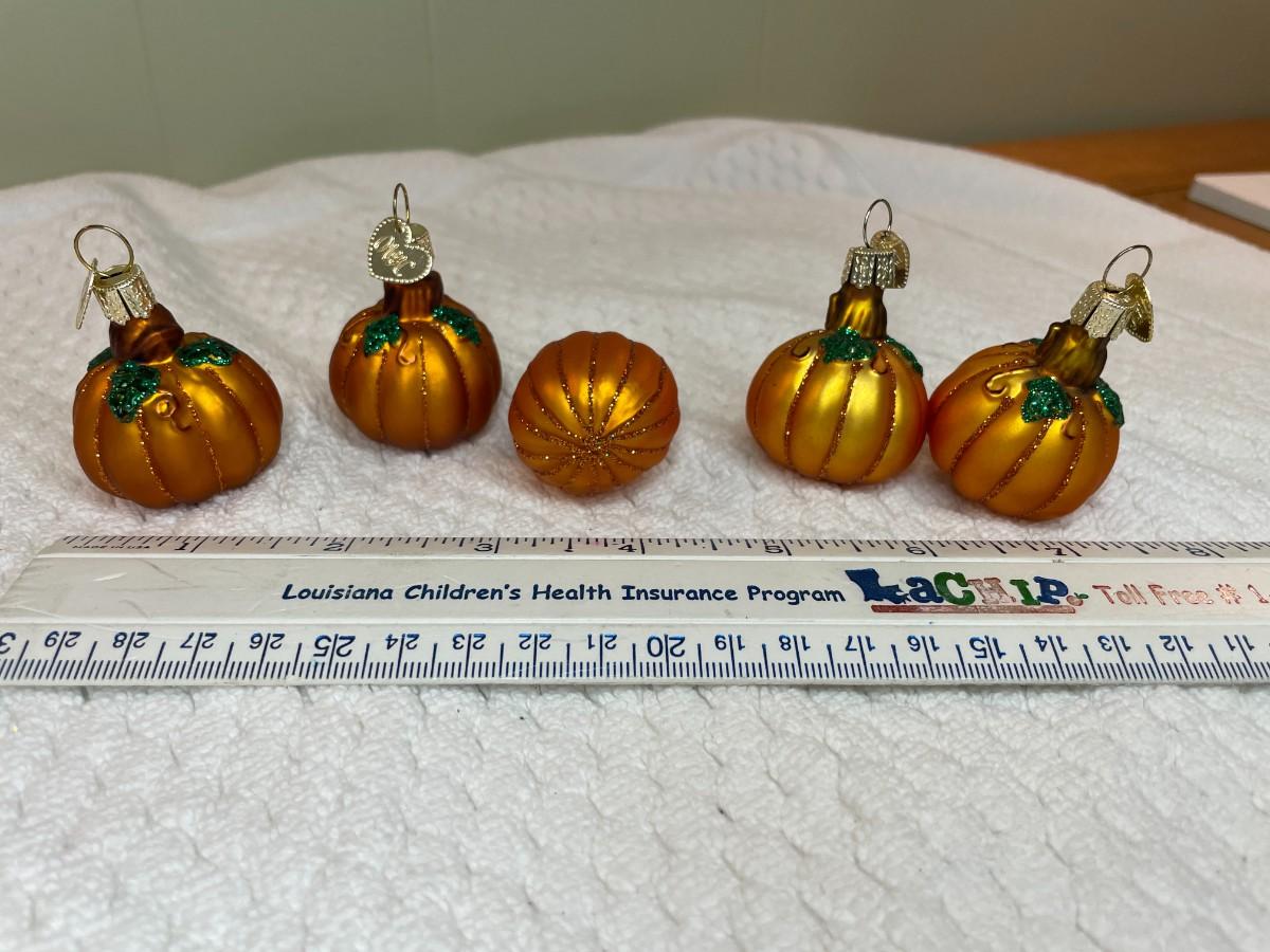 Set of 5 mini pumpkins, about 1.5" tall. Four are the same, one is different but we treat them all equally. All are Old World Christmas.