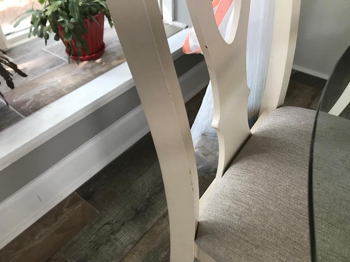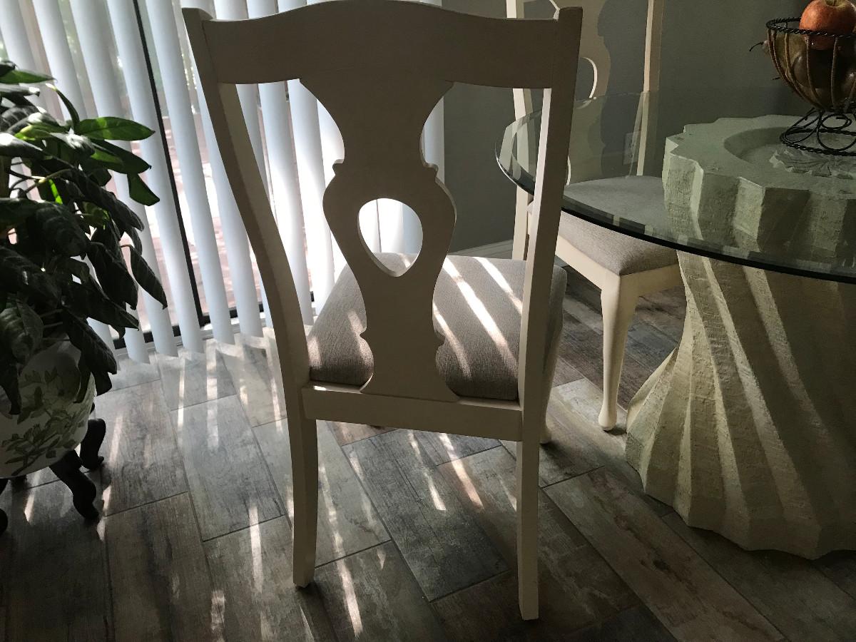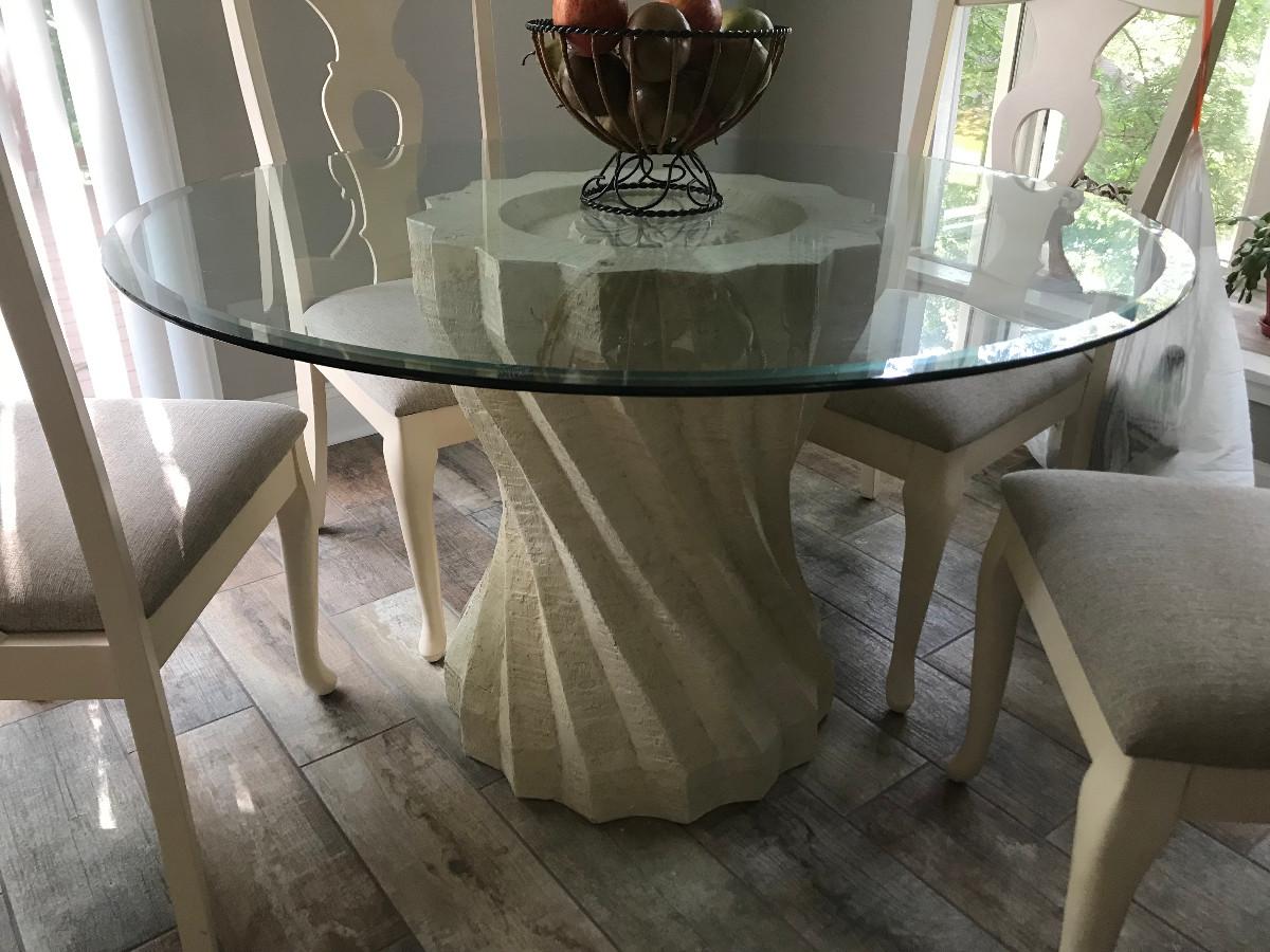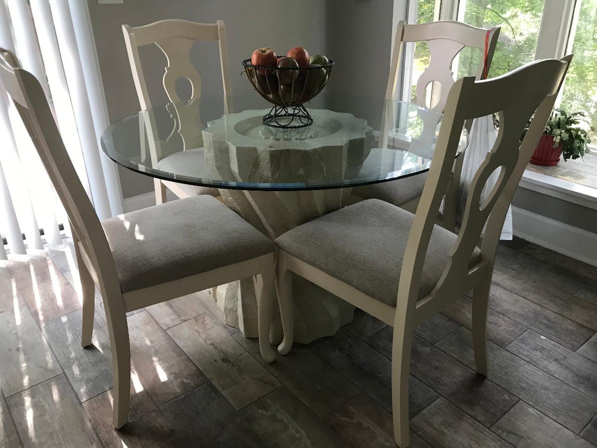 TABLE, GLASS TOP WITH BASE: 47.5"DIA X 29.25"H, SCRATCHES ON GLASS TOP , STAINS ON CHAIR CUSHIONS