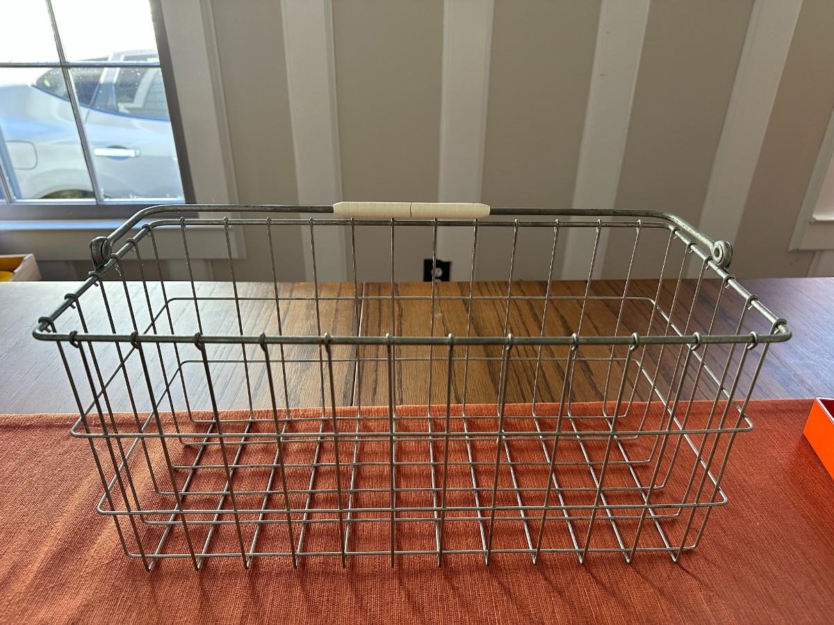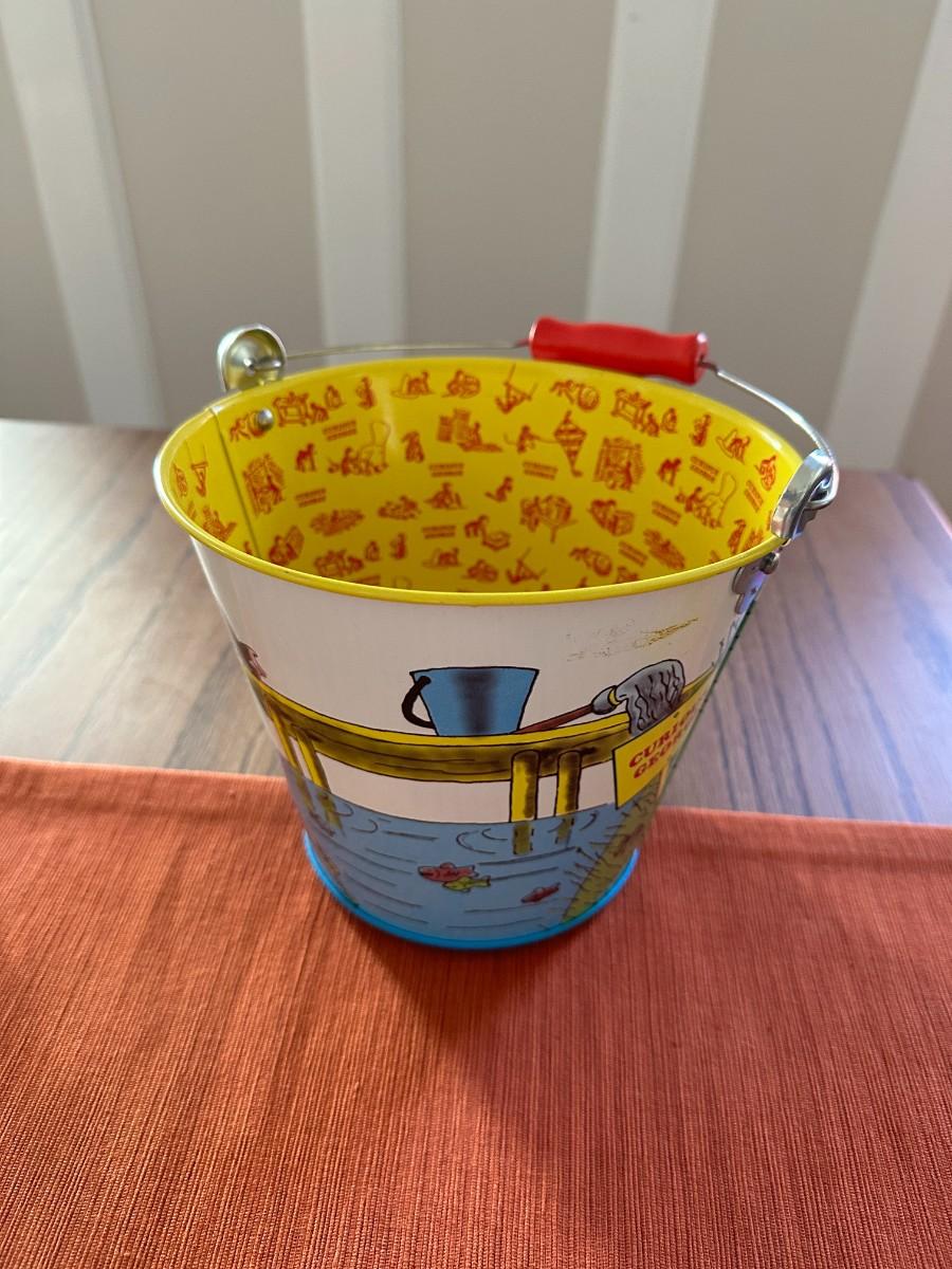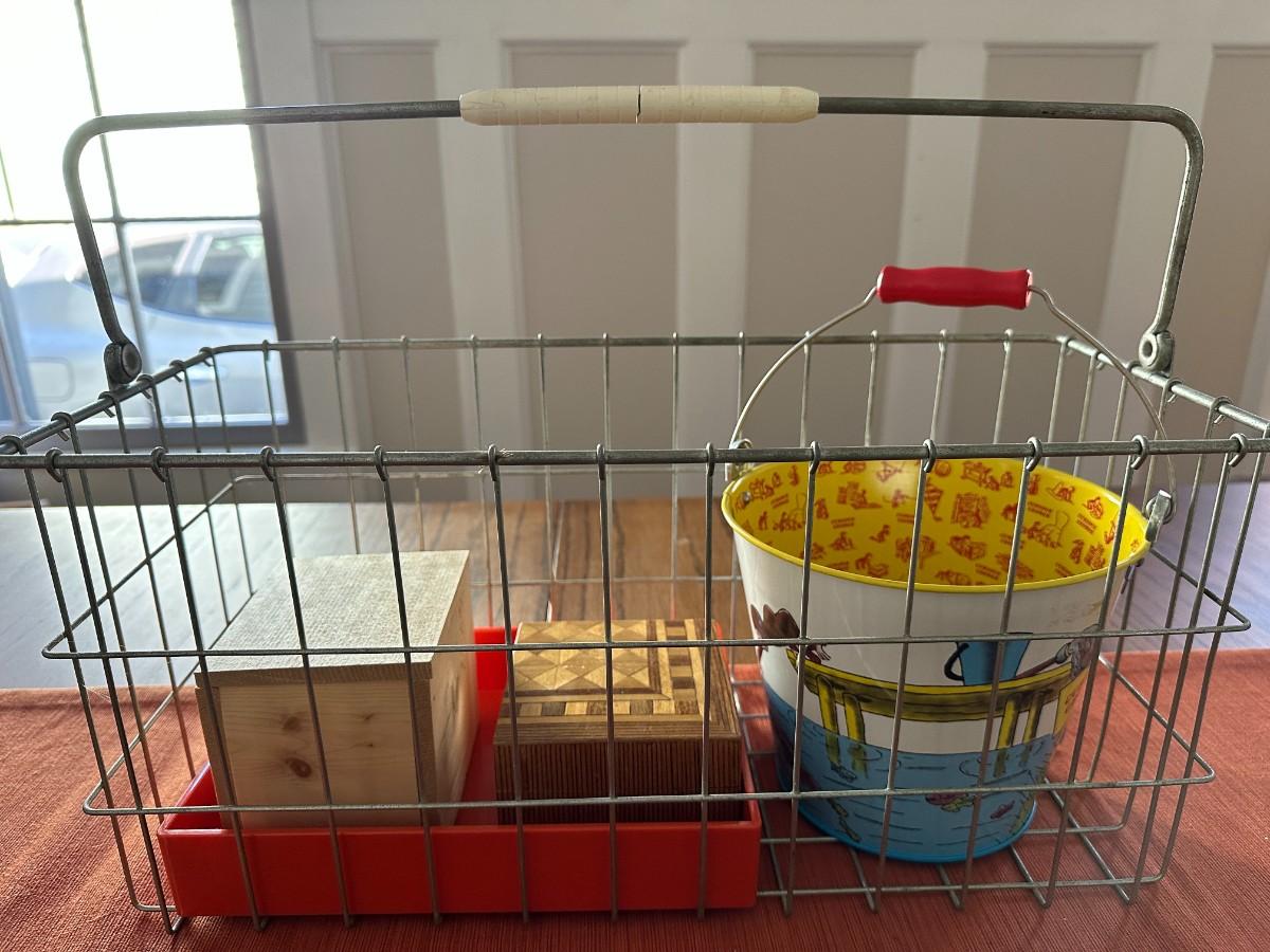 1 Metal Basket w/Handle 18"w x 8.5"h w/handle down, 1 Orange Tray 9.75"L x 7.25"D, 1 Decorative Box 4.25", 1 plain box 4.5" x 3.75", 1 Curious George Pail/Bucket 7.5"w x 6" h w/handle down