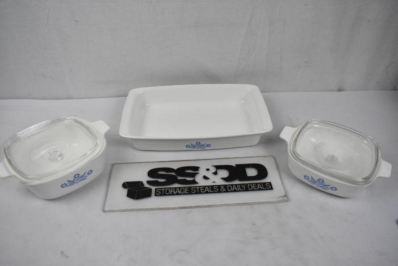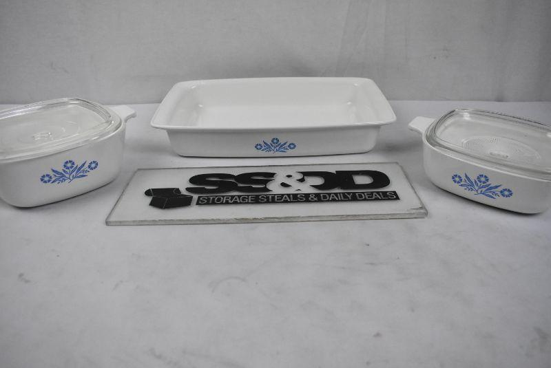5 pc Corning Ware, With w/ Blue Flowers. 2 Square dishes w/ lids, 1 rectangle