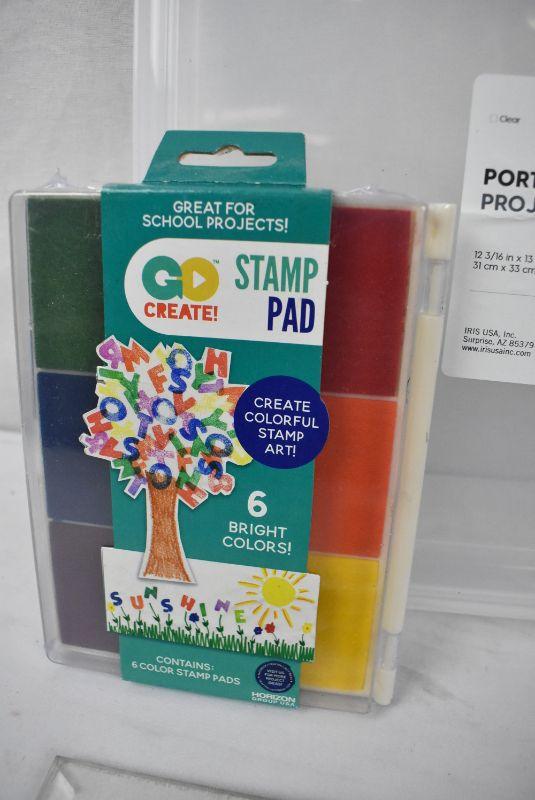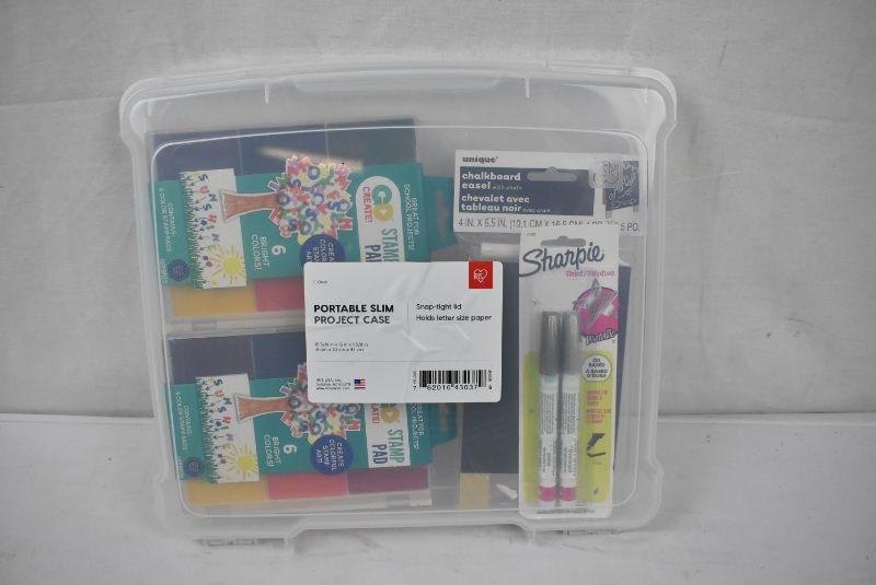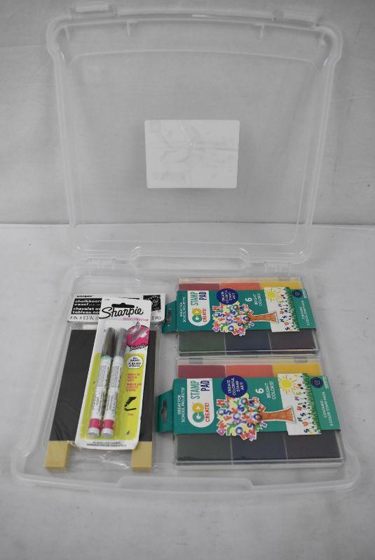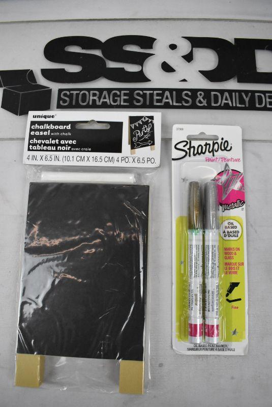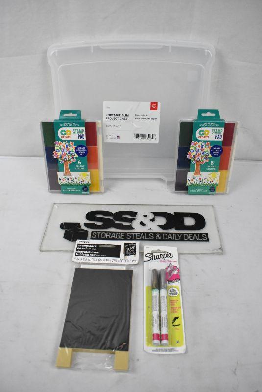 5 pc Crafting: Qty 2 Go Create Rainbow Stamp Pad, 6 Colors, IRIS USA, Slim Portable Project Case, Clear. Mini Chalkboard Easel Sign, 6.5in. Sharpie Oil-Based Medium Paint Marker Set, Silver & Gold - New