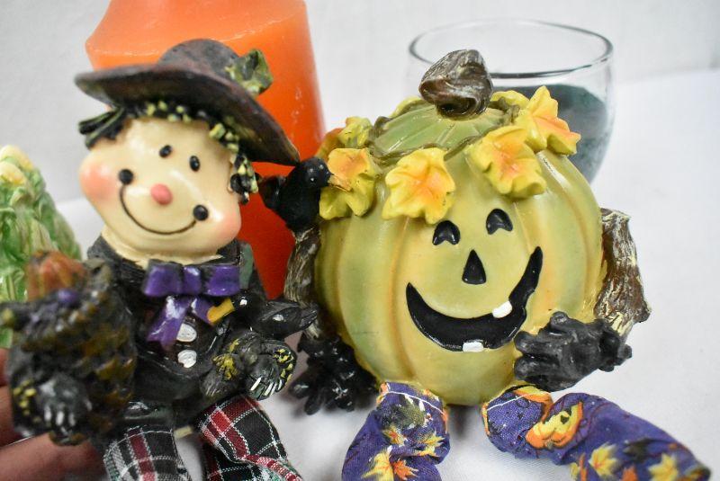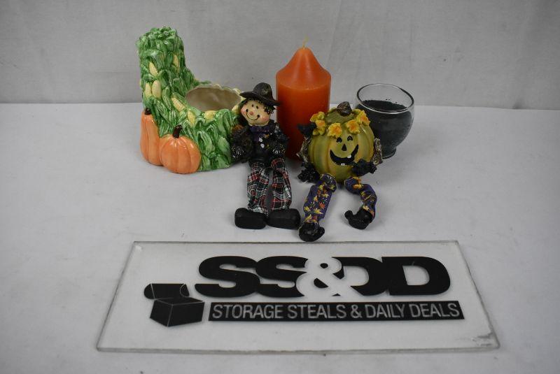 5 pc Fall/Halloween Decor: Candle Holder, 2 Candles, Scarecrow & Jack-o-Lantern