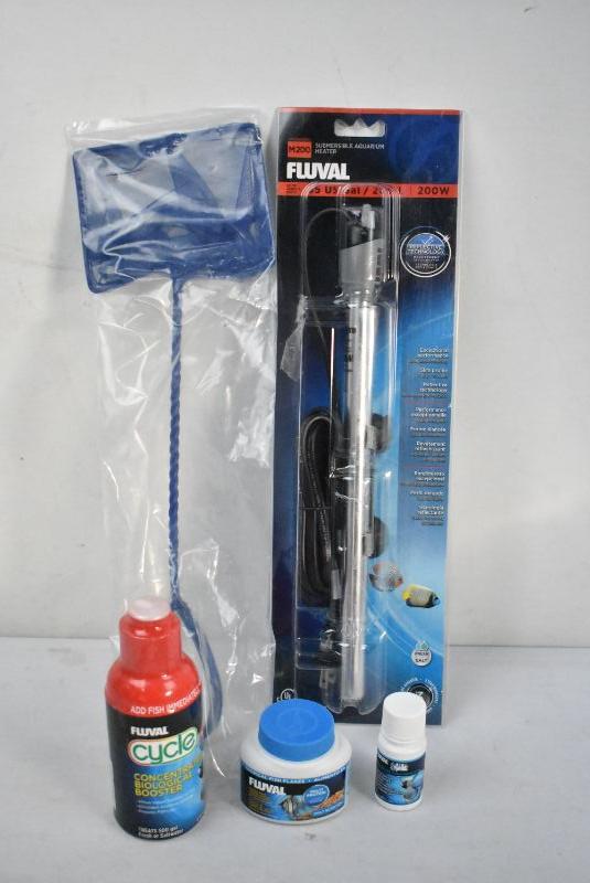 5 pc Fish Tank Accessories: Heater, Net, Bio Booster, Conditioner, Food - New