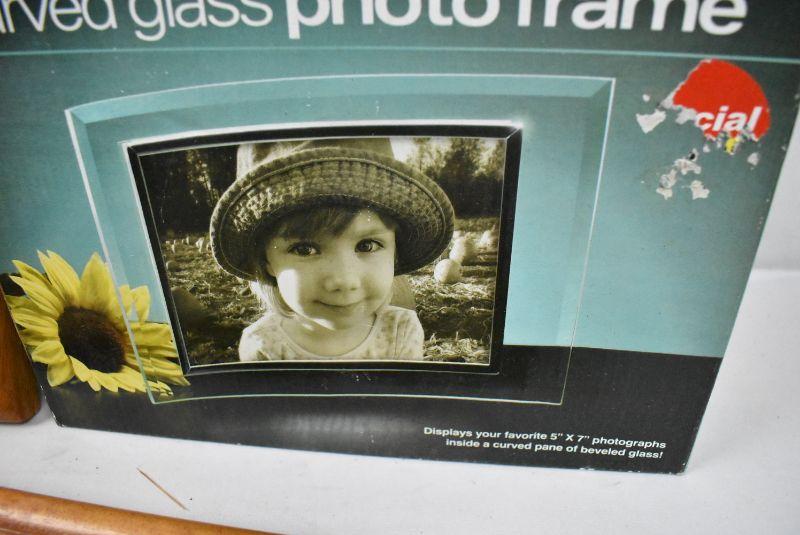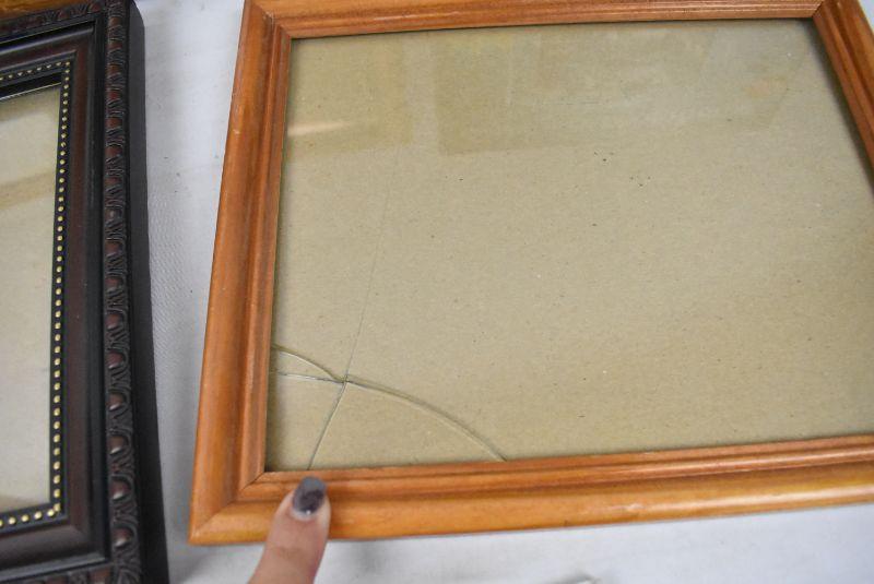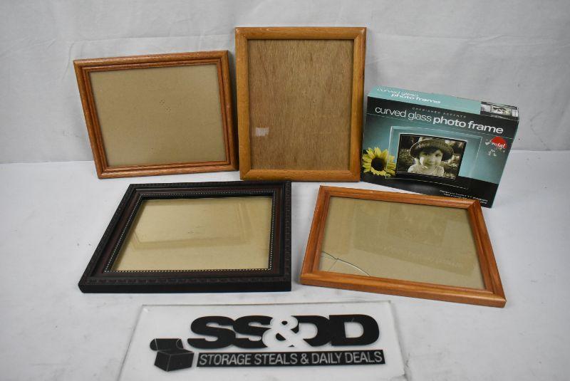 5 pc Frames: Four Wooden 8x10 (1 broken glass). 1 Curved Glass 5x7