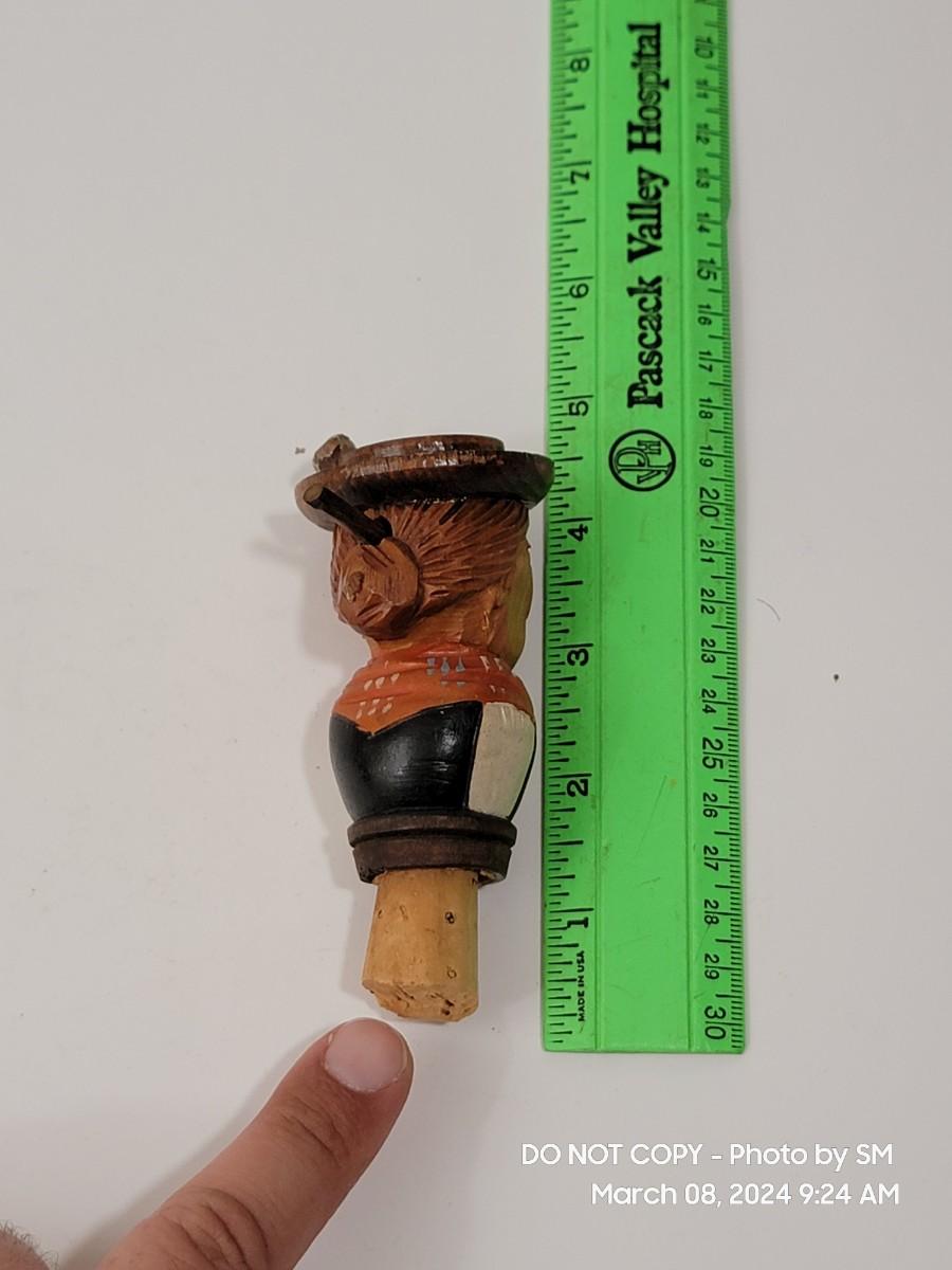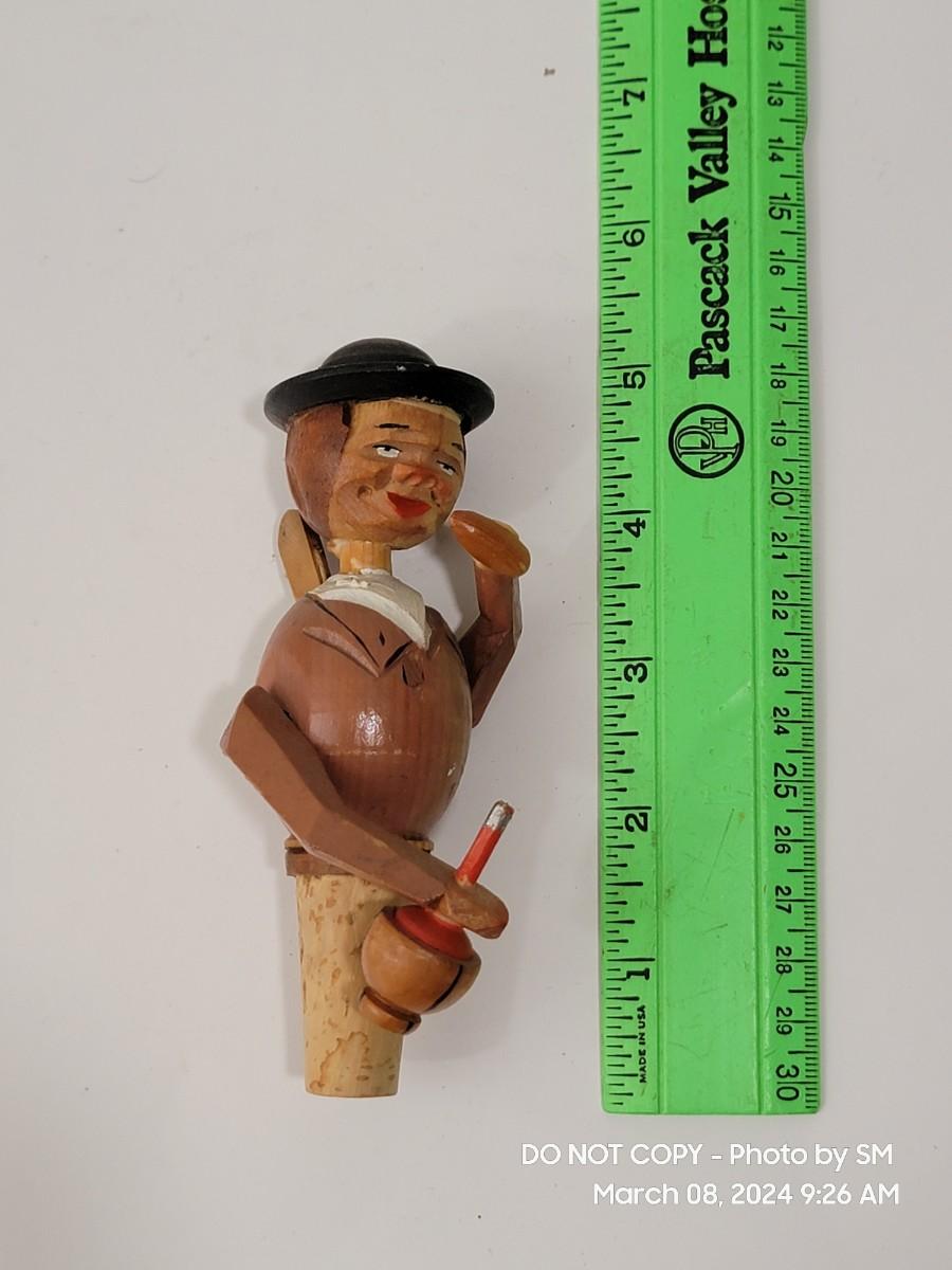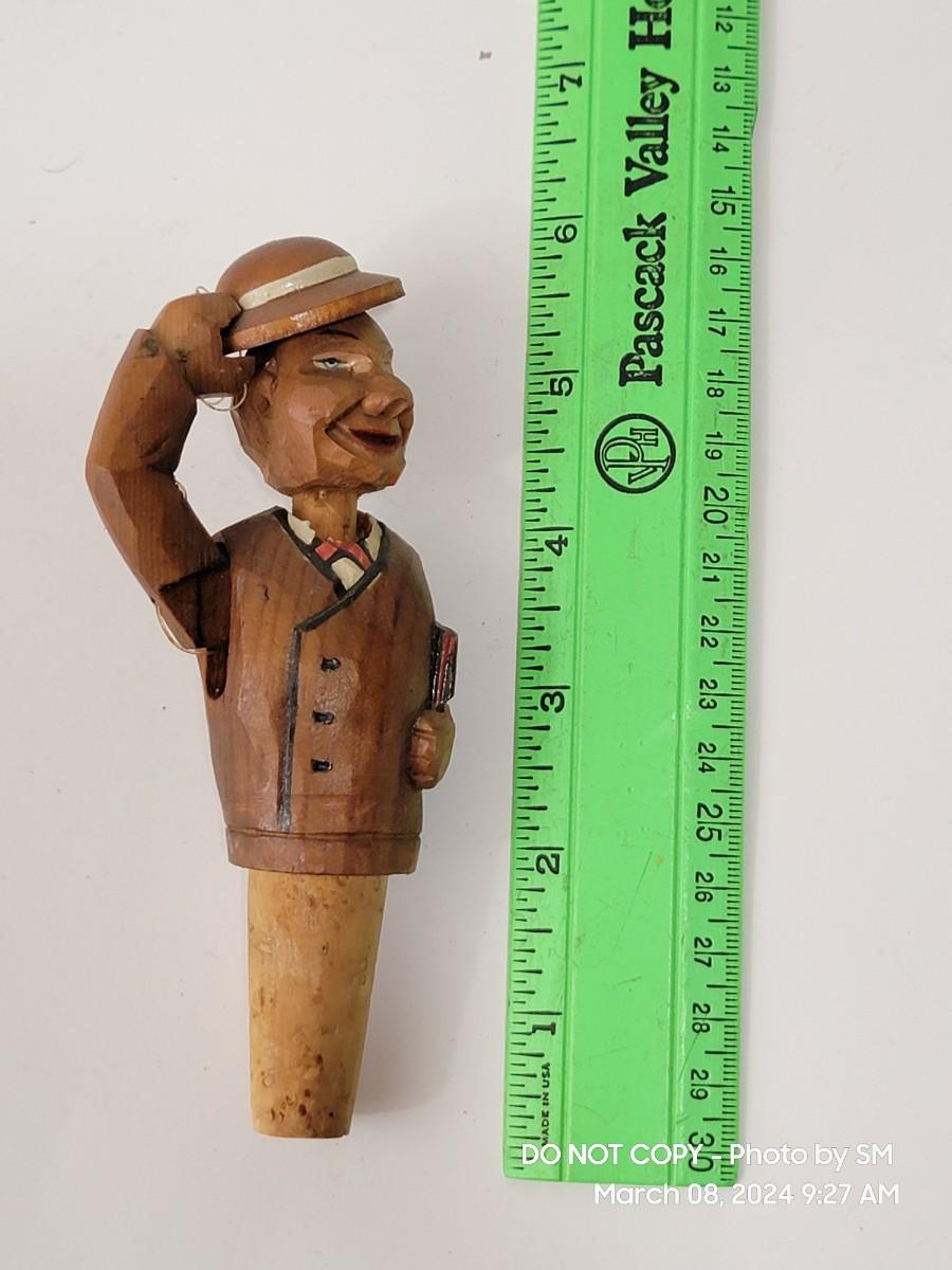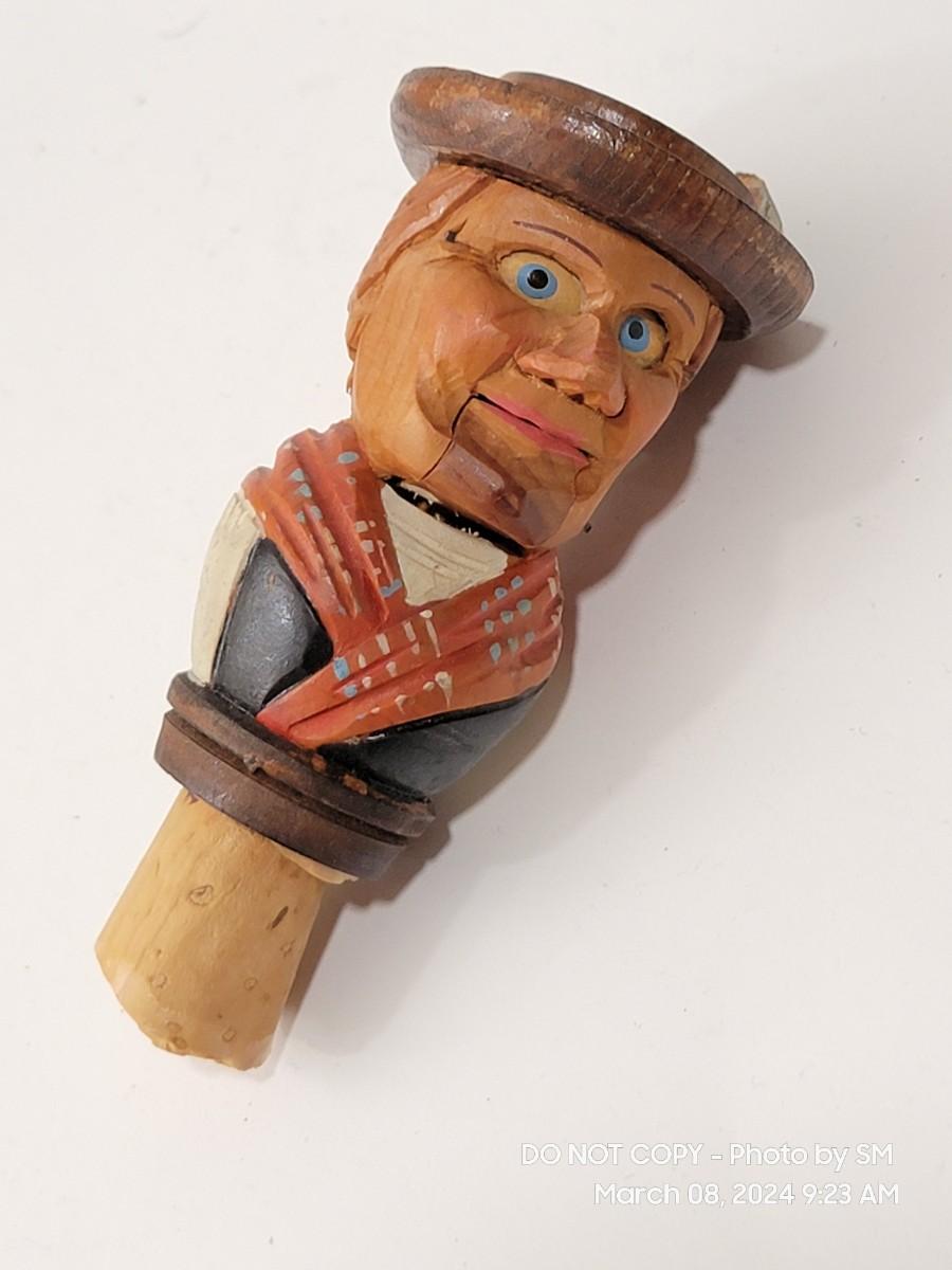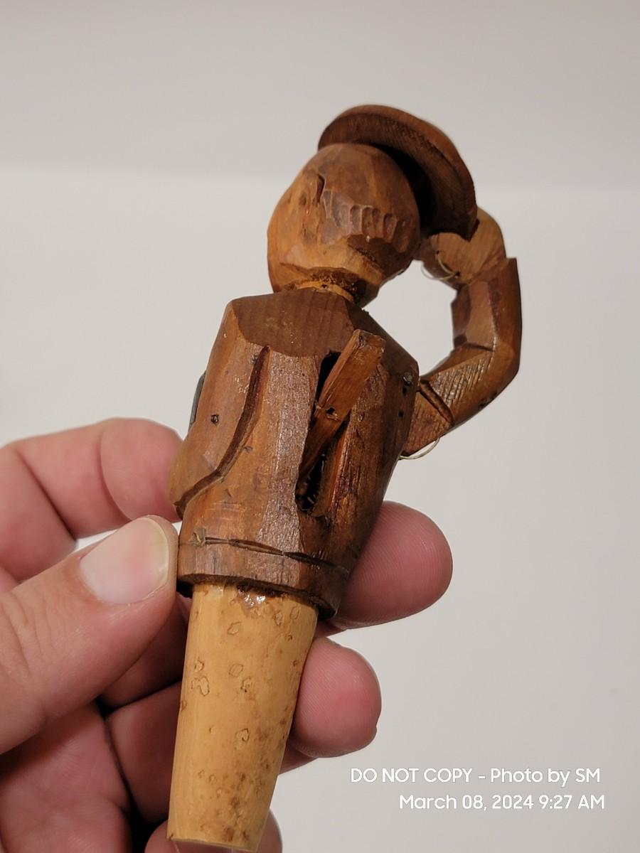 Fun, fun, fun,. 5 pieces total - 5 vintage wooden hand carved movable/ mechanical bottle stoppers. Looks like someone replaced some of the corks, but one of them still has a broken cork. Please note the piece of pottery these were standing in IS NOT INCLUDED that was for display. You will only get 5 stoppers. Two are hard to move the lever, but gently it will work - as I demonstrated each, in open and closed position.