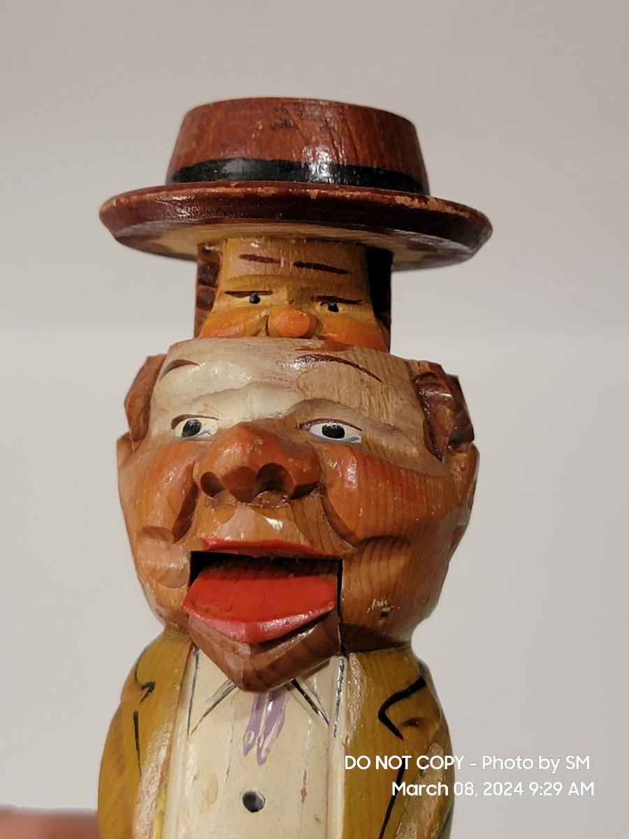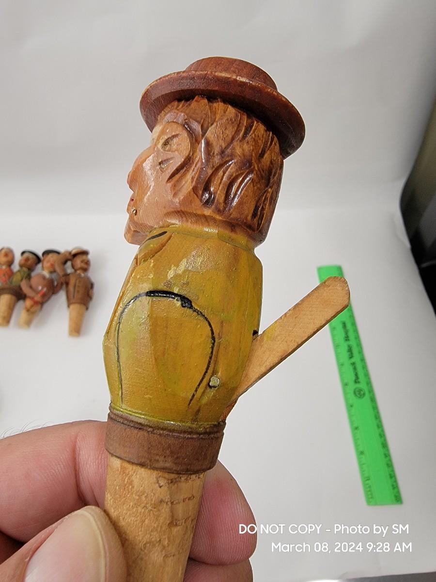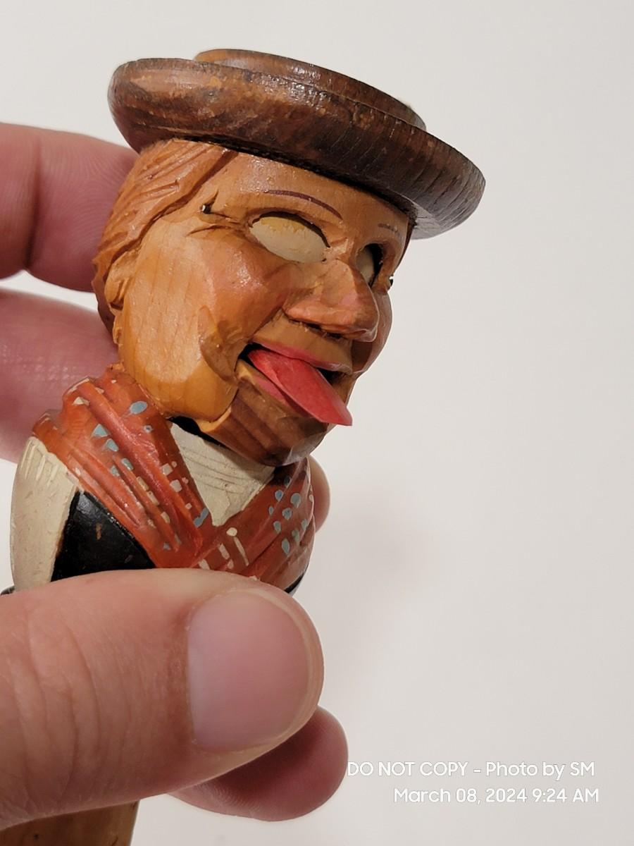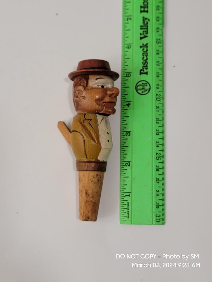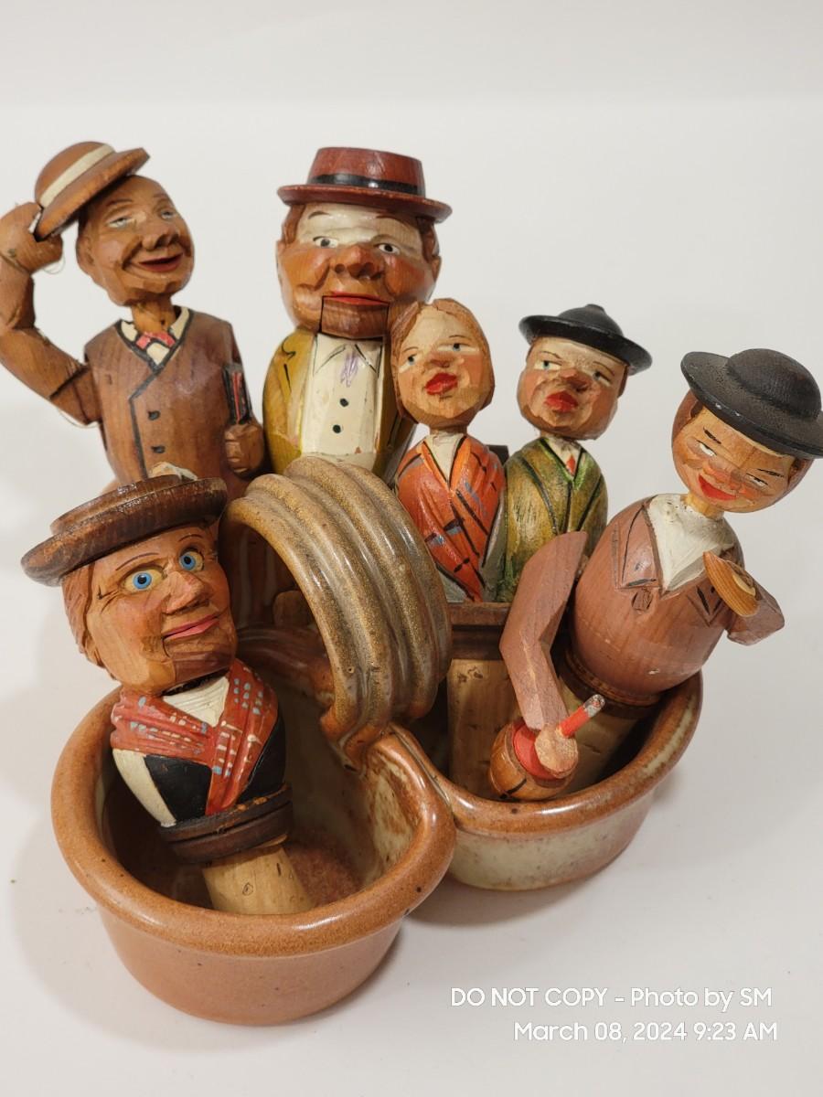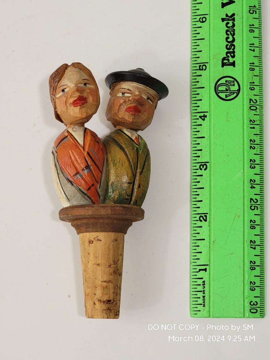 Fun, fun, fun,. 5 pieces total - 5 vintage wooden hand carved movable/ mechanical bottle stoppers. Looks like someone replaced some of the corks, but one of them still has a broken cork. Please note the piece of pottery these were standing in IS NOT INCLUDED that was for display. You will only get 5 stoppers. Two are hard to move the lever, but gently it will work - as I demonstrated each, in open and closed position.