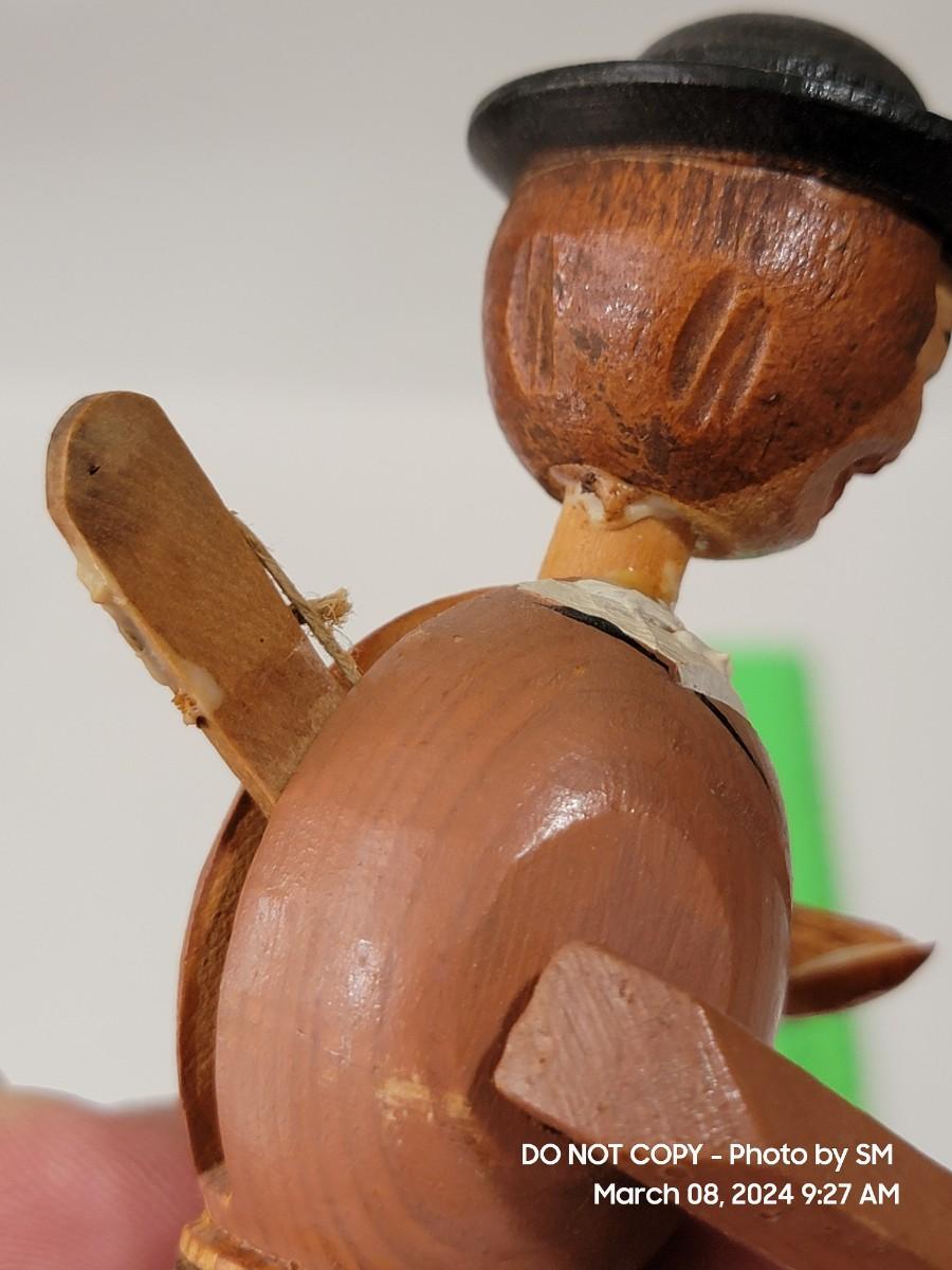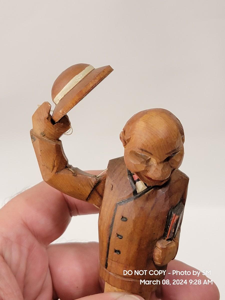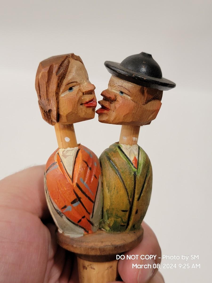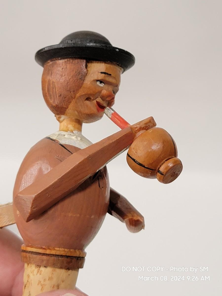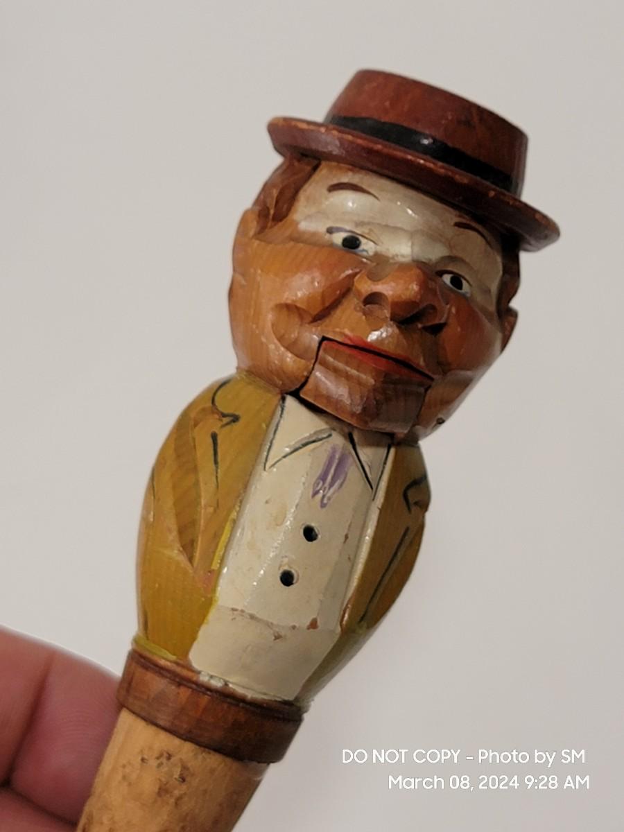 Fun, fun, fun,. 5 pieces total - 5 vintage wooden hand carved movable/ mechanical bottle stoppers. Looks like someone replaced some of the corks, but one of them still has a broken cork. Please note the piece of pottery these were standing in IS NOT INCLUDED that was for display. You will only get 5 stoppers. Two are hard to move the lever, but gently it will work - as I demonstrated each, in open and closed position.