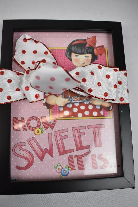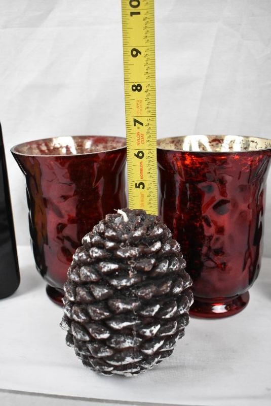 5 pc Home Decor: Halloween Tin, 2 Red Glass Candle Holders, 1 pinecone candle, 1 Mary Engelbreit Framed Image