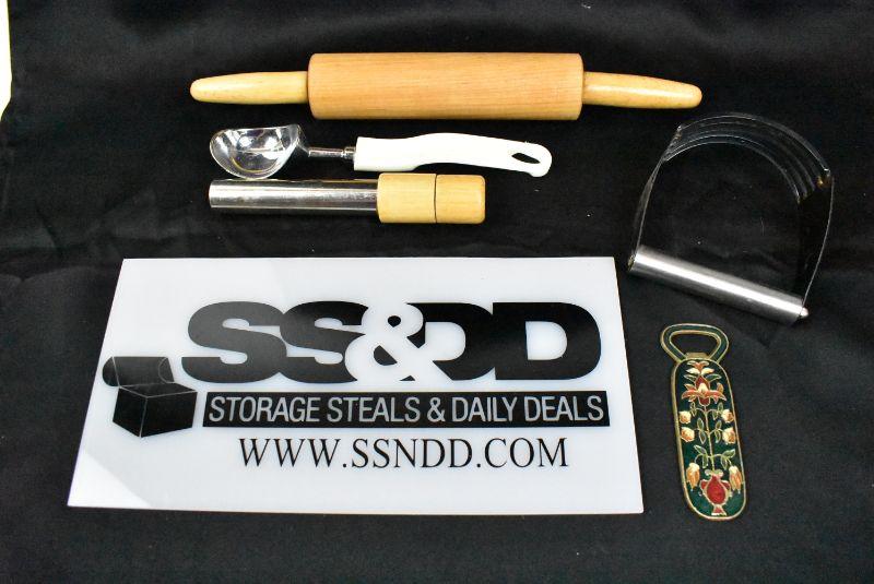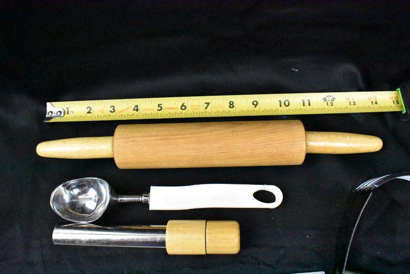 5 pc Kitchen Misc Cooking Tools: Small Rolling Pin, ice cream scoop, apple corer, pastry blender, bottle opener