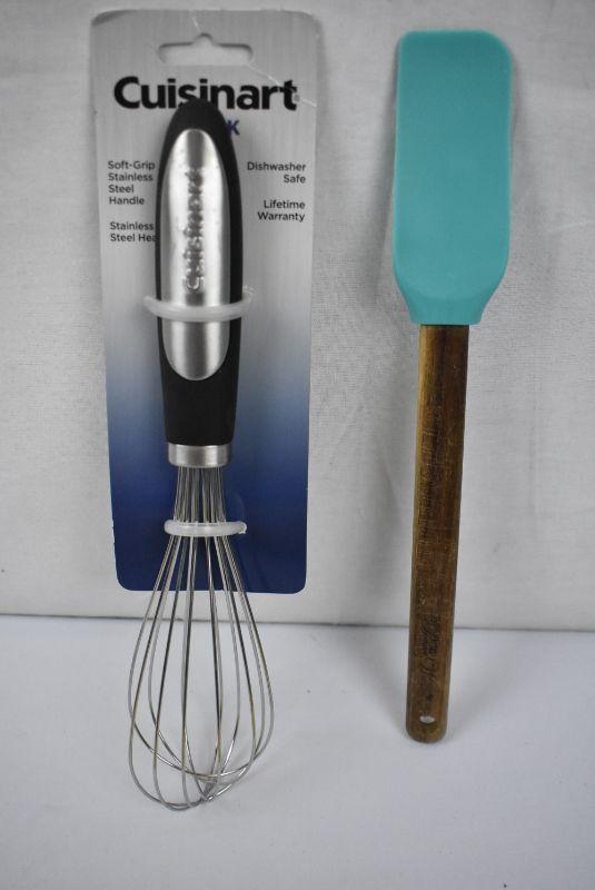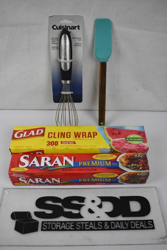 5 pc Kitchen: Cuisinart Elements Collection Whisk, Pioneer Woman Scraper Spatula, Glad ClingWrap Plastic Food Wrap, 300 Square Feet, Saran Premium Wrap 100 sq ft, & Color Scents Medium Trash Bags, 8 Gallon, 40 Bags (Twist Tie, Vanilla Flower Scent) - New