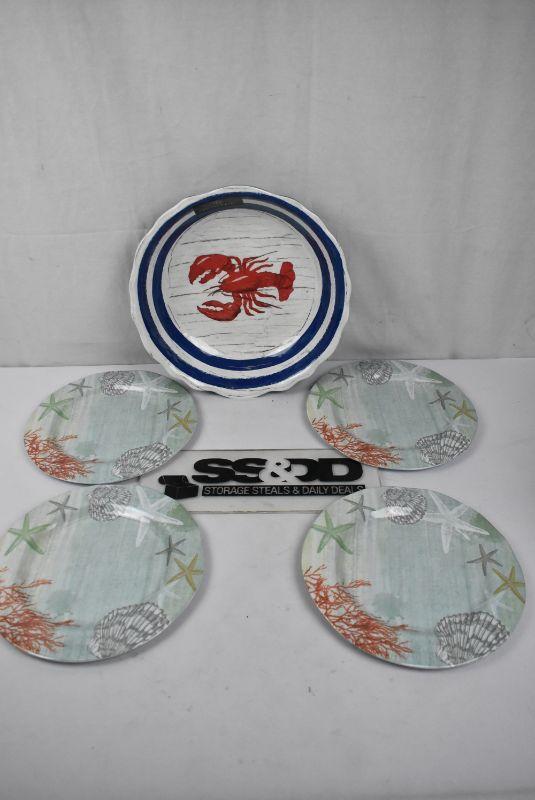 5 pc Melamine Dinnerware. Ocean Theme: Lobster Serving Bowl & Shells/Starfish Plates (4)