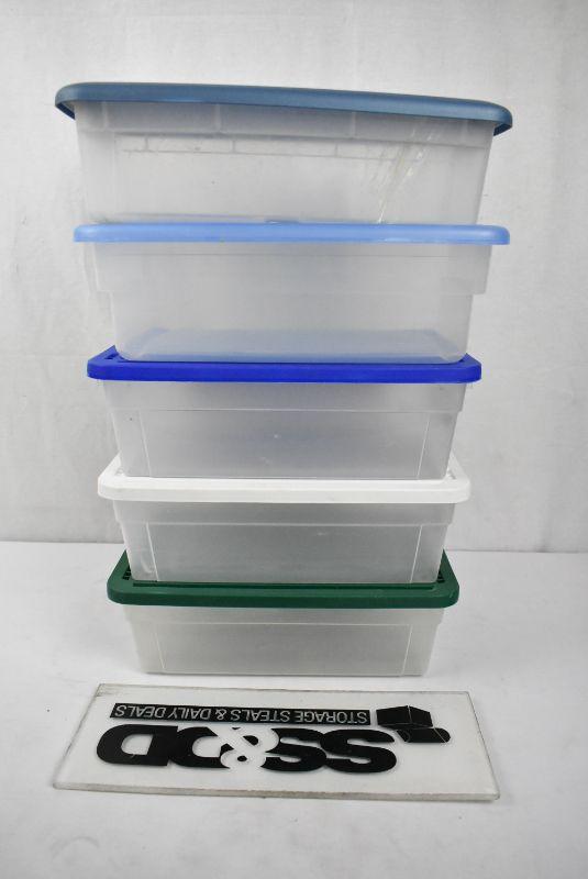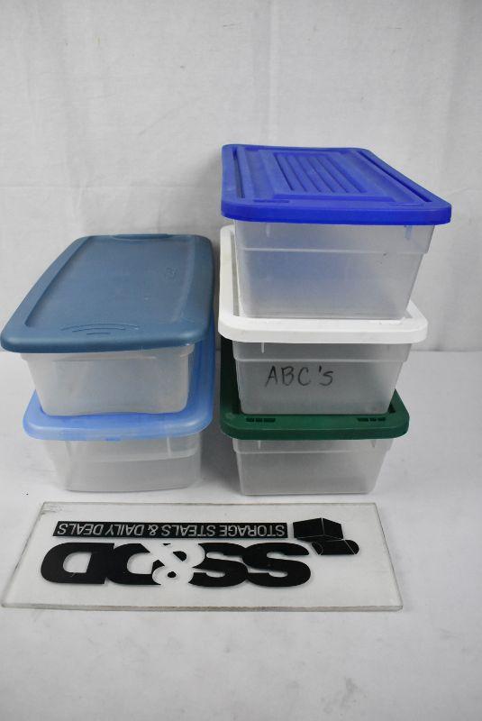 5 pc Plastic Storage Bins, Shoebox Size. Clear with Blue/white/green lids. Needs cleaning