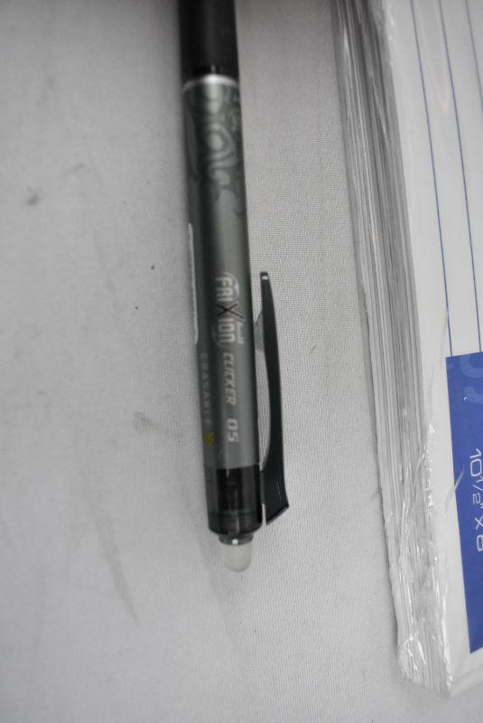 5 pc School/Office: Pilot FriXion Clicker Erasable Gel Ink Retractable Pen, Black Ink, .5mm, one pen -PIL32520, 2 packages wide ruled paper, & Paper Mate Pink Pearl Erasers, Large, 3 Count - New