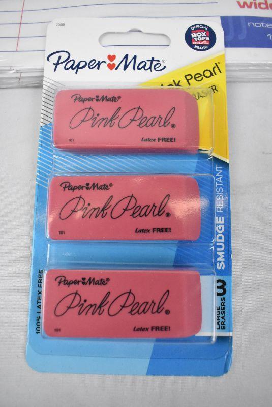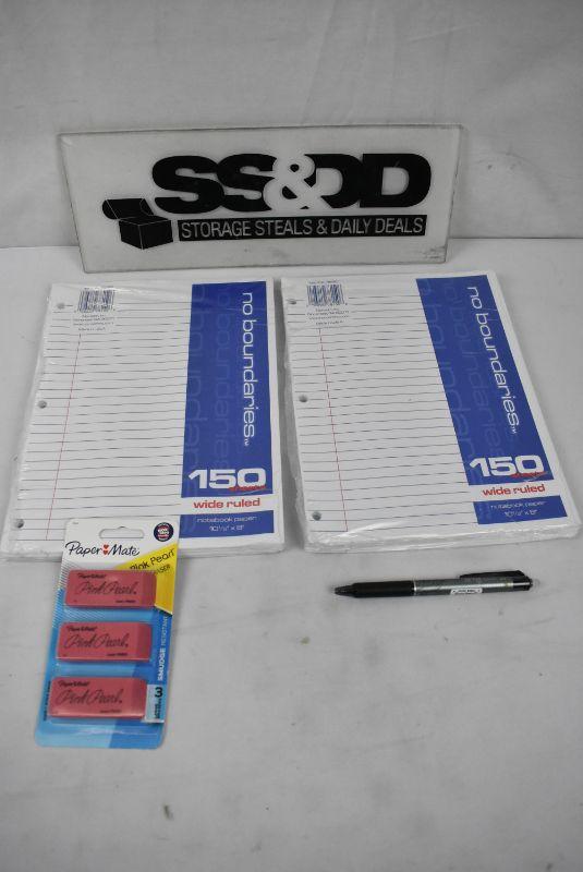 5 pc School/Office: Retractable Pen, wide ruled paper, & Pink Erasers - New