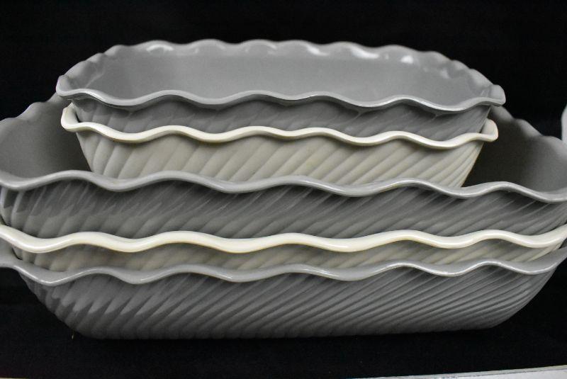5 pc Serving Ware. Looks like glass, but is plastic. Small gray, small cream, medium cream, 2 medium gray
