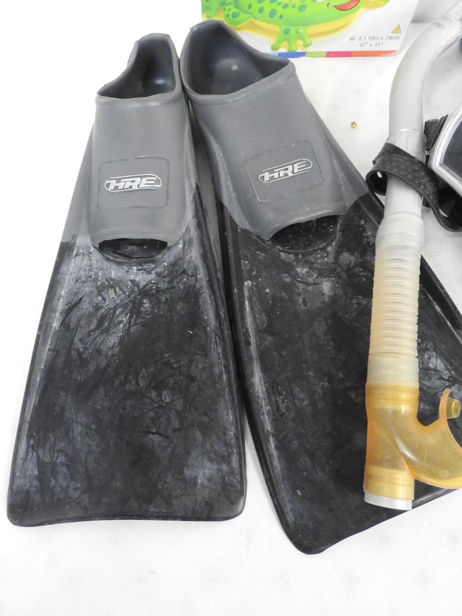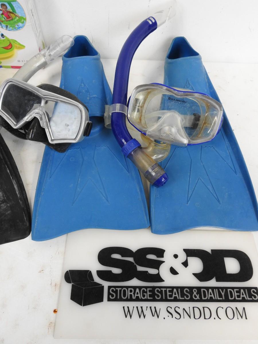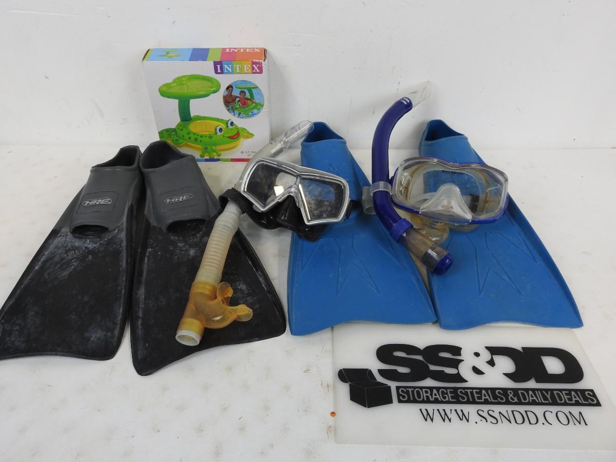 5 pc Swim Gear: 2 Pairs Flippers, 2 Snorkel Goggles, 1 Inflatable Frog Floaty