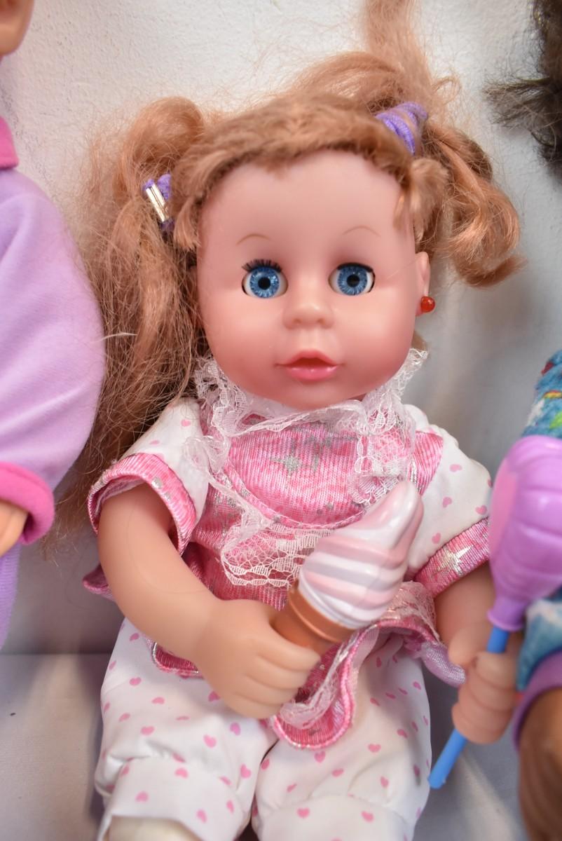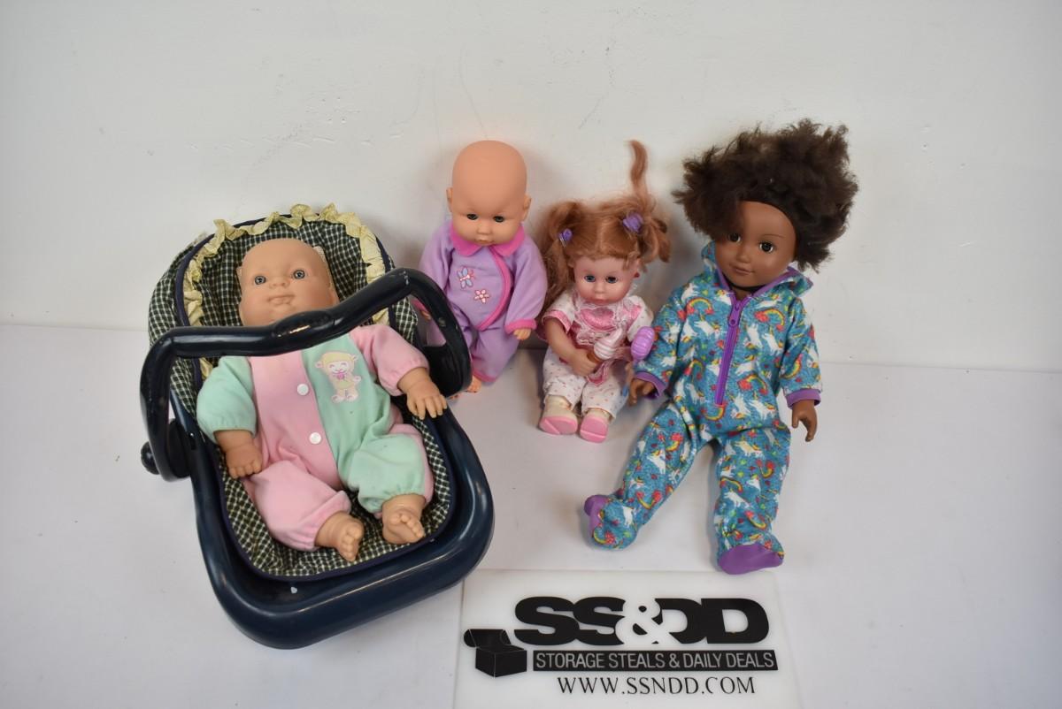 5 pc Toys: 4 Dolls & 1 Doll Carrier Seat