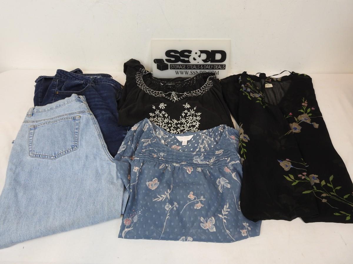 5 pc Women's Clothing: Denim Capri Pants 12 & 16, 3 Tops L & XL