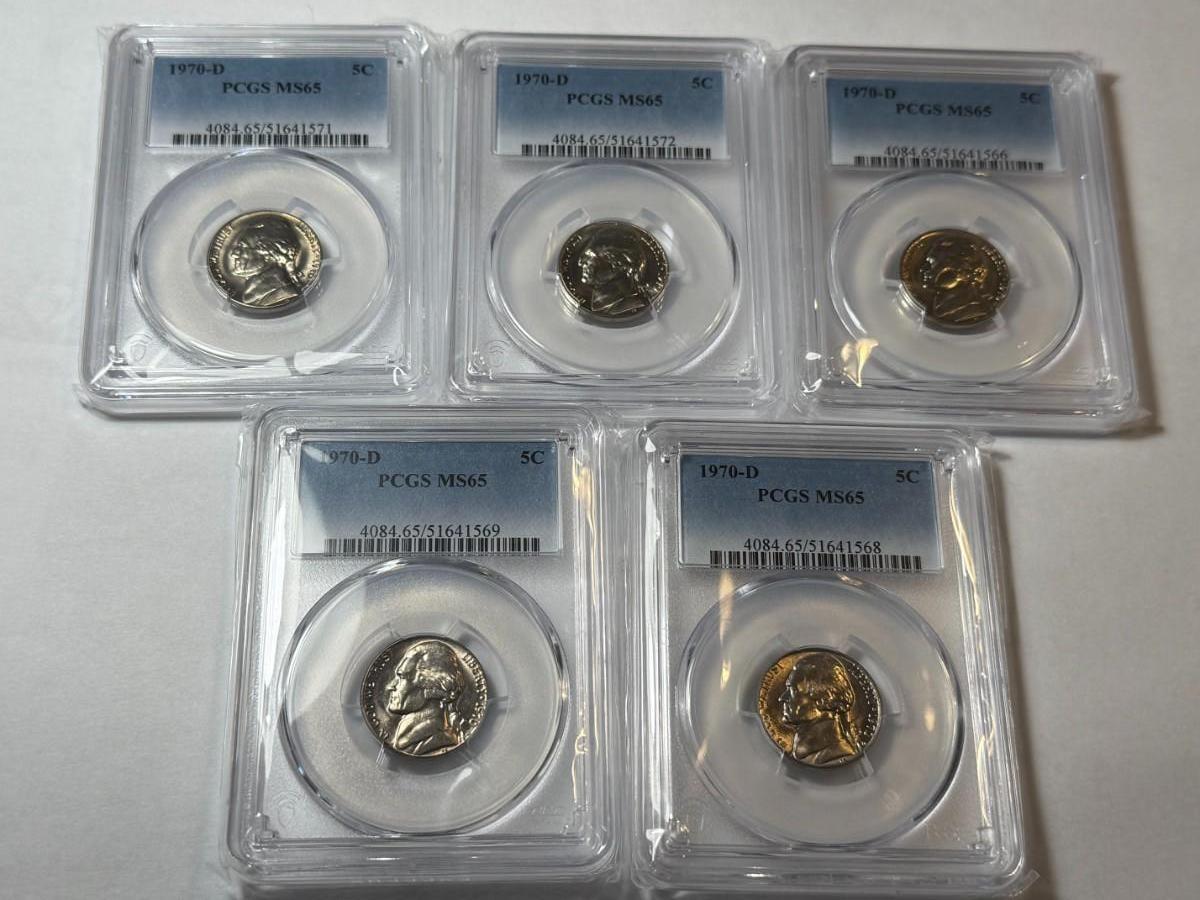 (5) PCGS CERTIFIED 1970-D MS65 CHOICE CONDITION JEFFERSON NICKEL LOT AS PICTURED. $5 DOMESTIC SHIPPING.