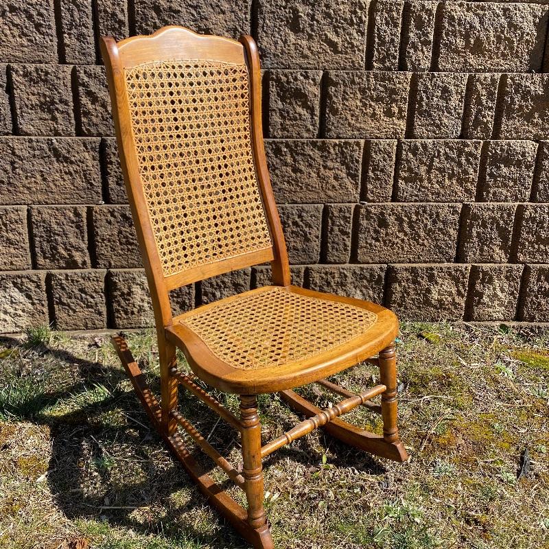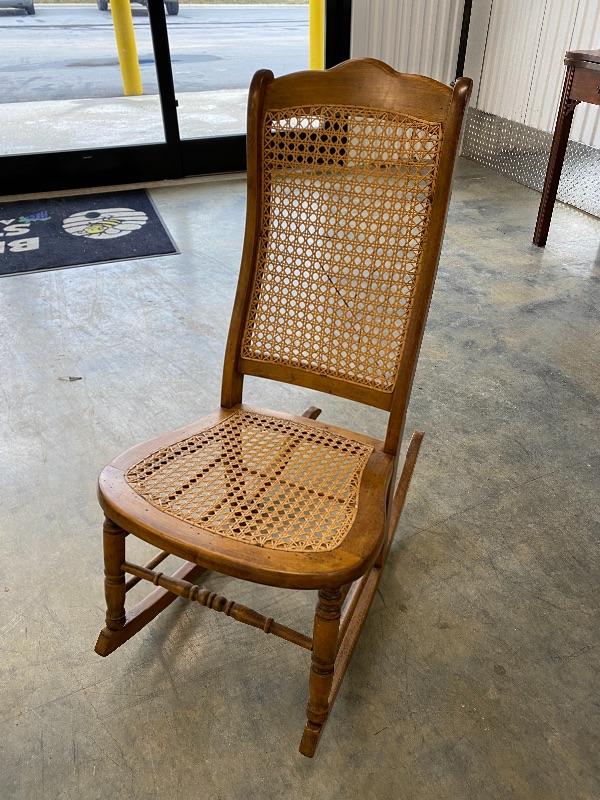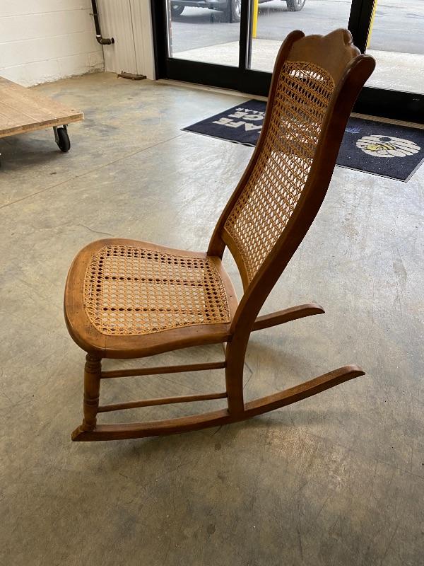 This cute rocker has a cane bottom and back. Both in great condition. The rocker is a bit on the small side which makes it perfect for extra seating in a small room. 18"w x 32"d x 37"h (seat is 16"h)