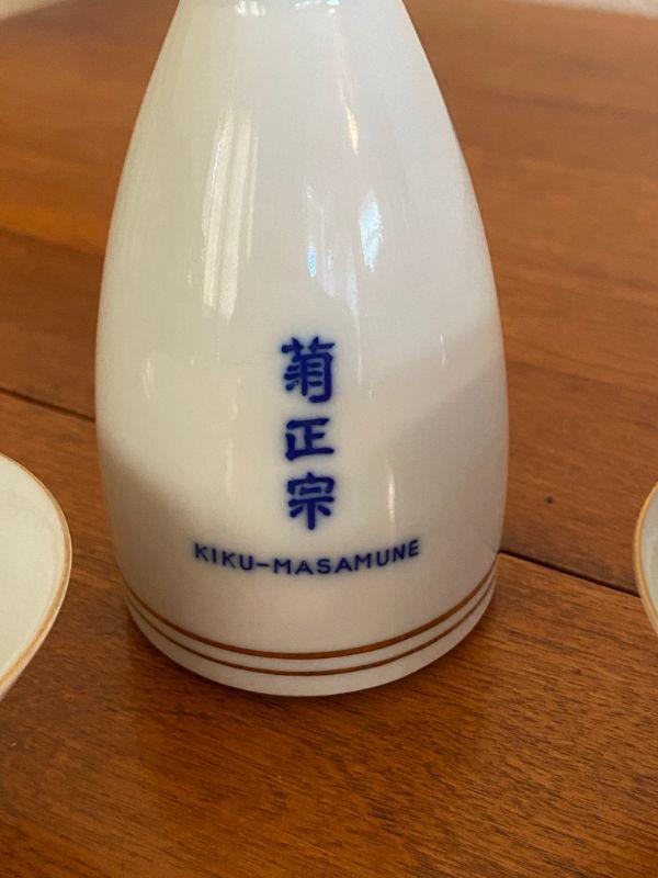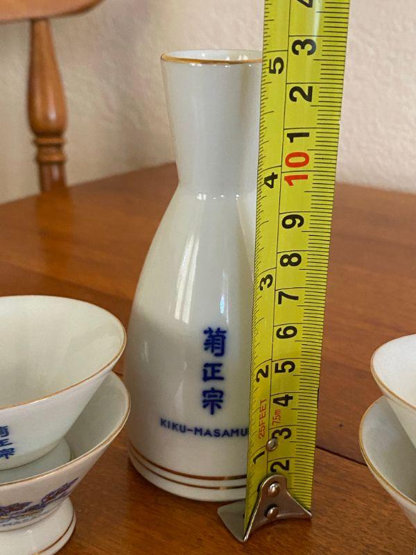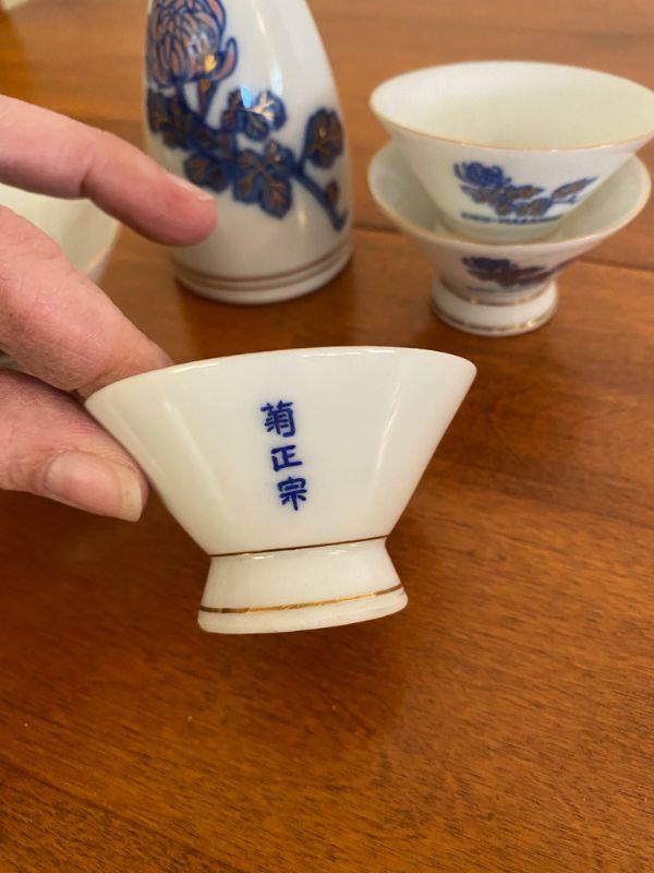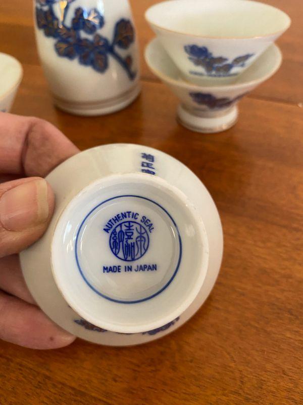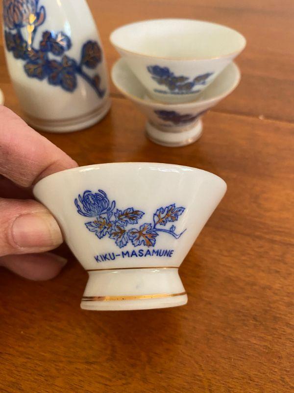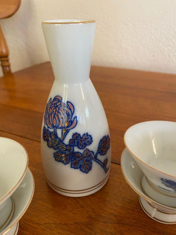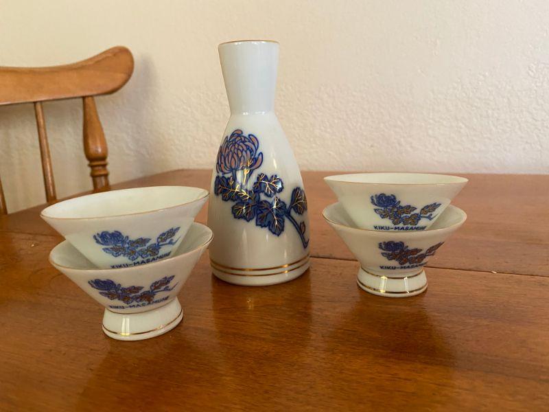 Vintage 5 piece Kiku-Masamune sake set. White with blue and gold flowers. Good vintage condition