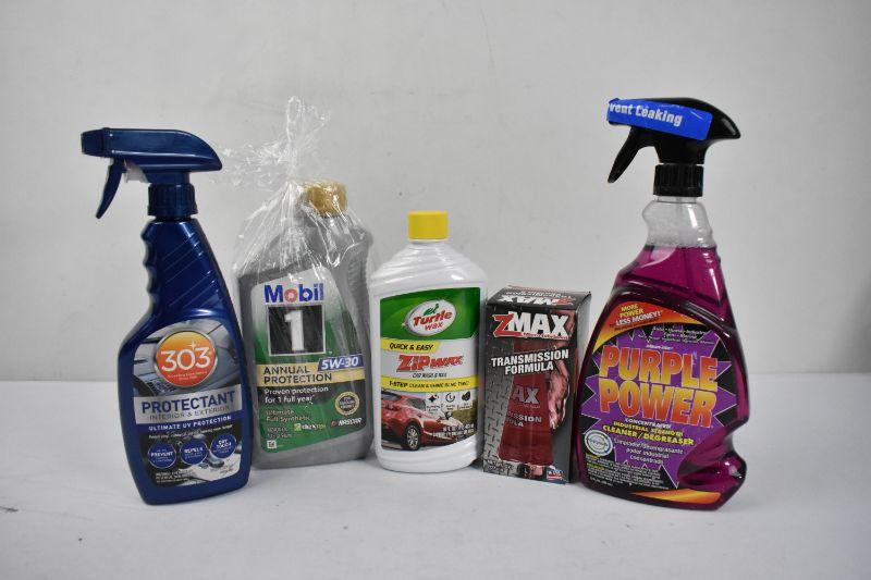 5 Piece Car Care Kit: Exterior/Interior Protection, 5W-30 Motor Oil 1 Quart, Zip Wax, Transmission Formula, and Purple Power Cleaner - New