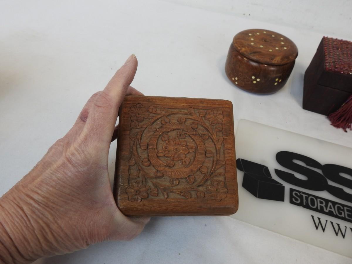 5 Piece Curio Lot: Great for Jewelry etc. 3 Wood, 1 Glass, 1 Silver
