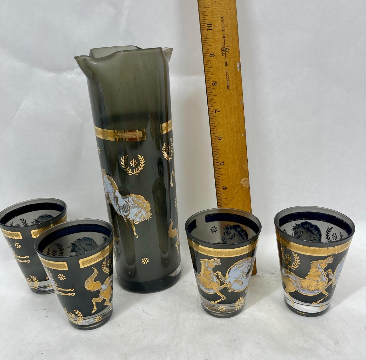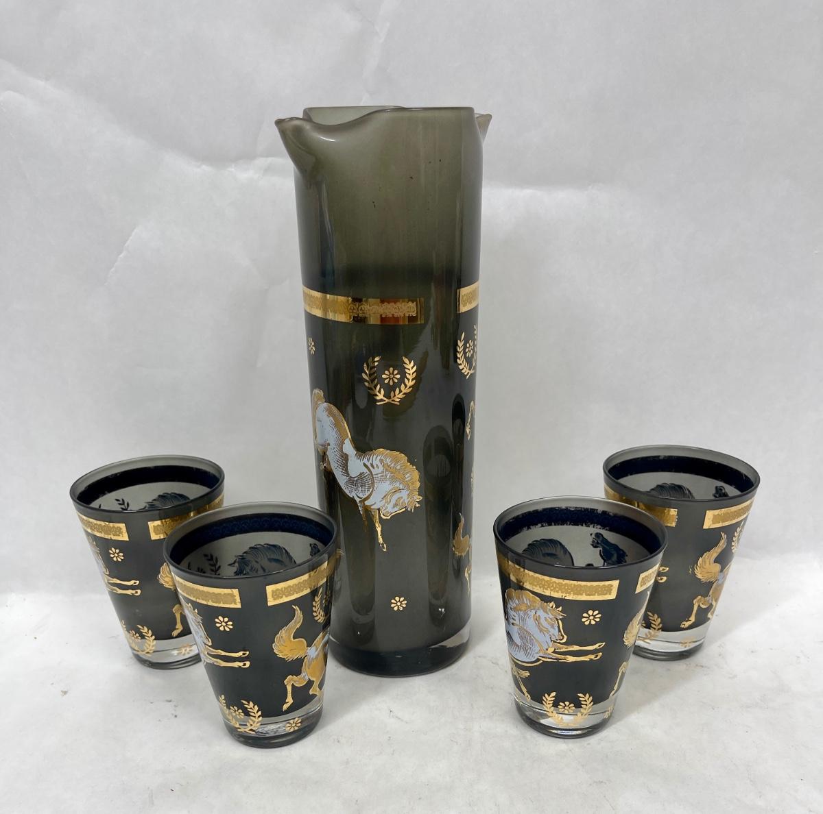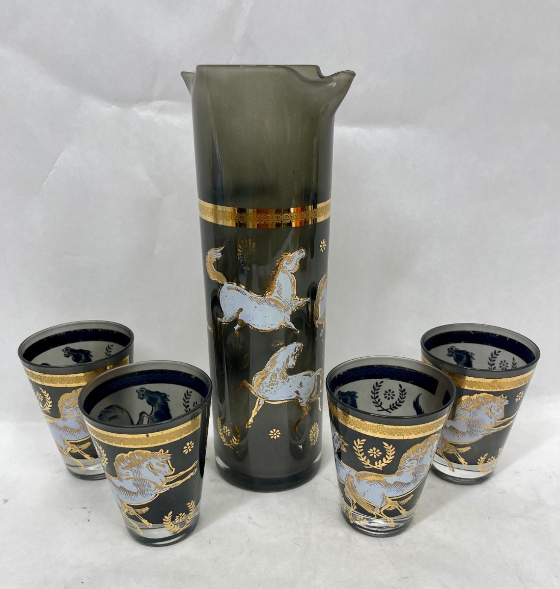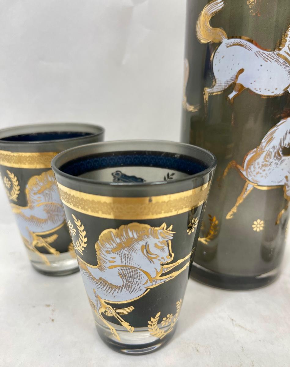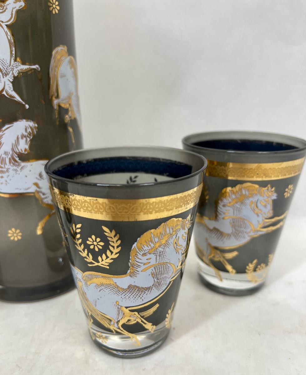 5 piece MCM frosted painted glass decanter & glass set blue gray with white painted horses with gold accents