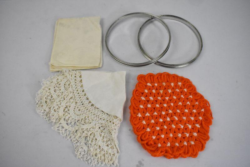 5 Piece Kitchen & Crafting: Napkin, Embroidery Rings, Doily, & Crochet Hot Pad