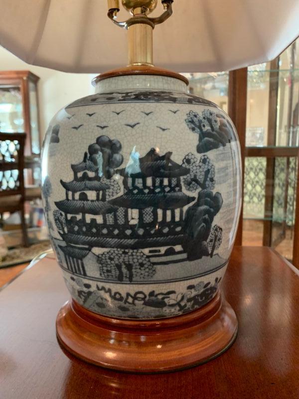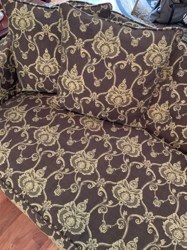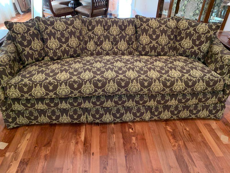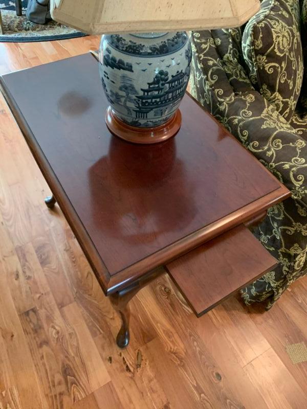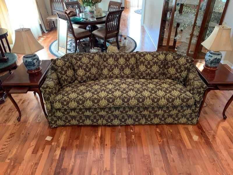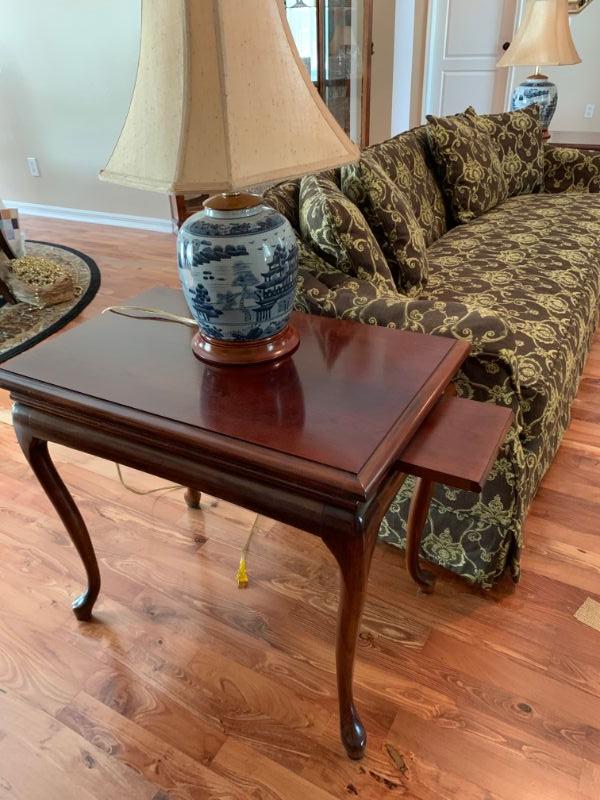 Beautiful upholstered Sofa with matching pillows, two cherry finish side tables with pull out shelf and two matching blue, Asian style lamps