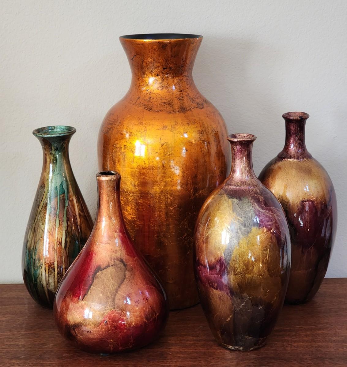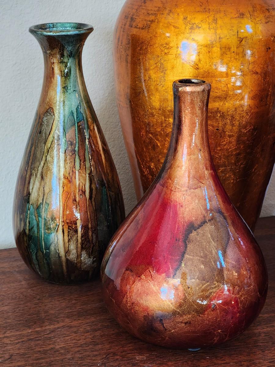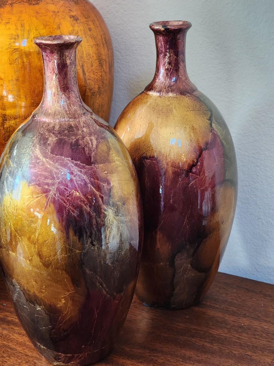 2 - 13" tall jug shaped vases in golds, greens and maroon.