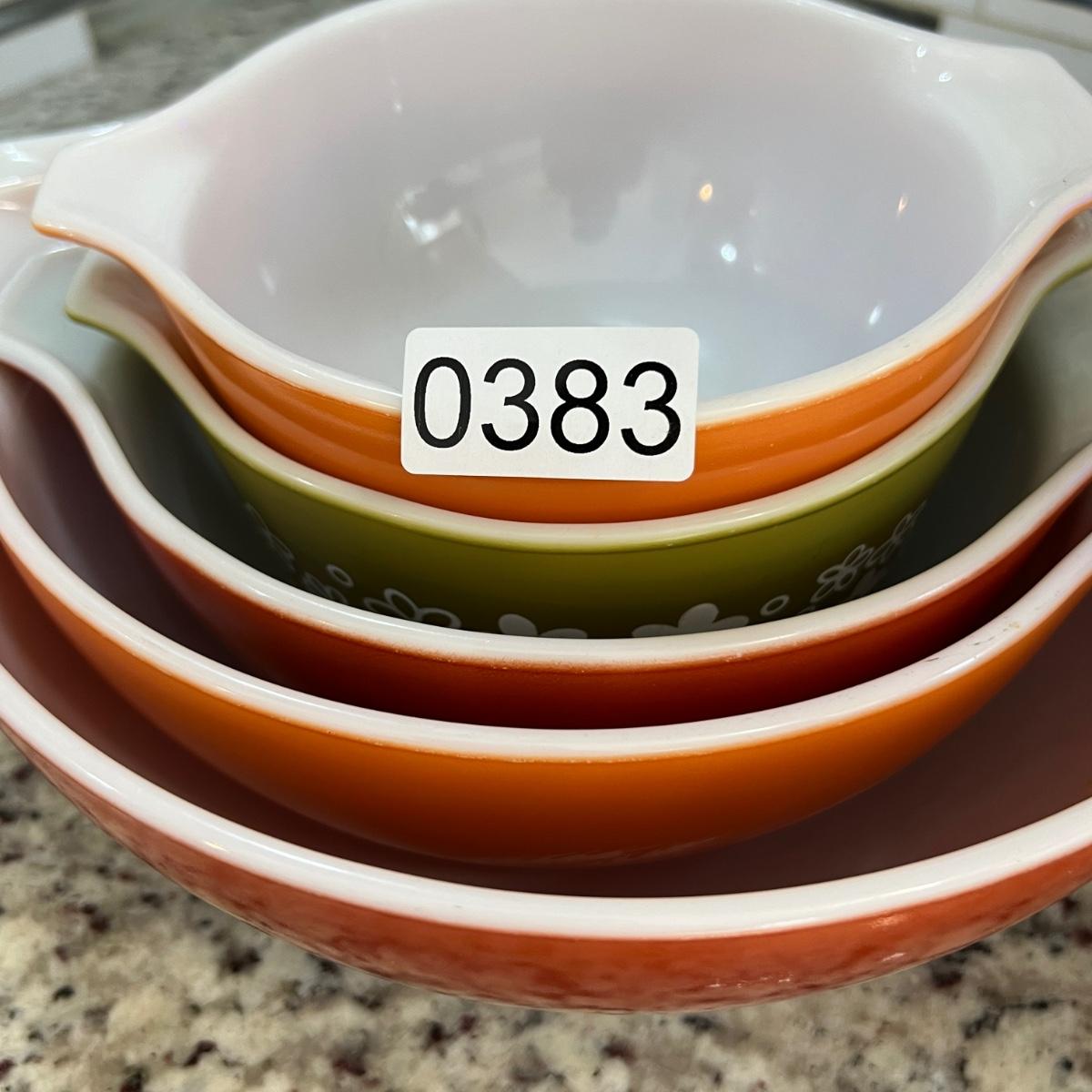 4 nesting “Autumn Harvest” mixing bowls and 1 “Spring Blossom” small casserole dish without a lid.