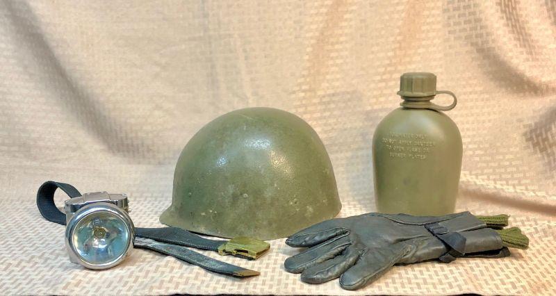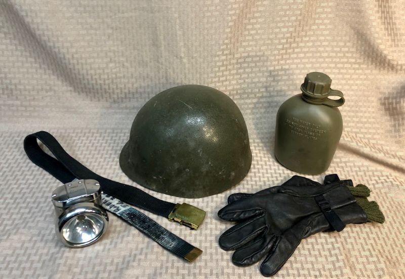 5 Piece Military Uniform Accessory lot. Belt, gloves, plastic canteen, helmet liner, and small Chrome belt-clip style flash light. Signs of wear and use.