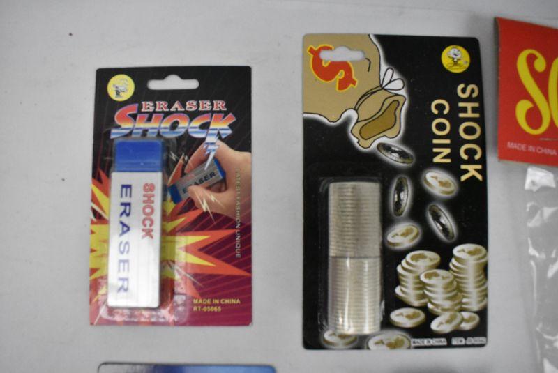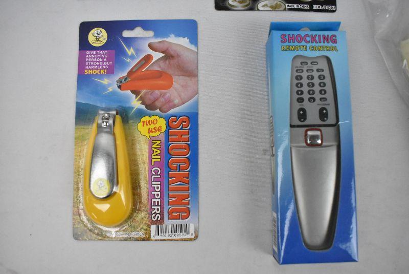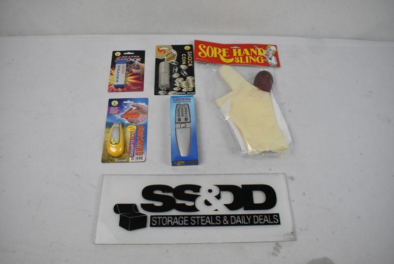 5 Piece Practical Jokes Lot: Sore Hand with Sling, Shocking Eraser, Shocking Coin, Shocking Nail Clippers, and Shocking Remote Control - New