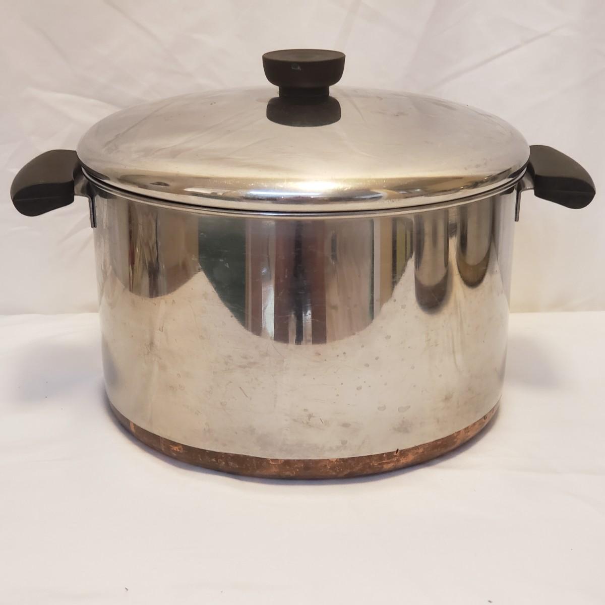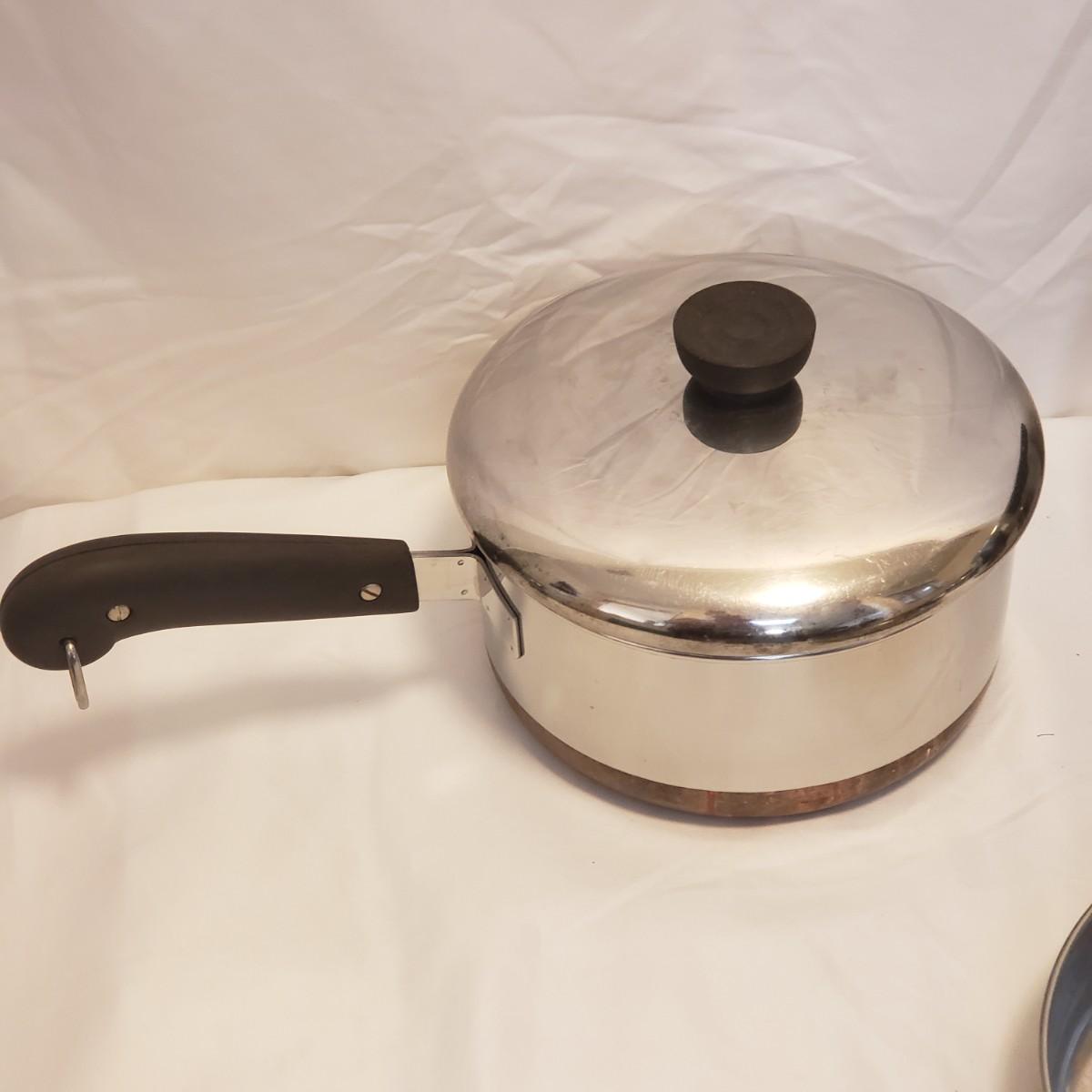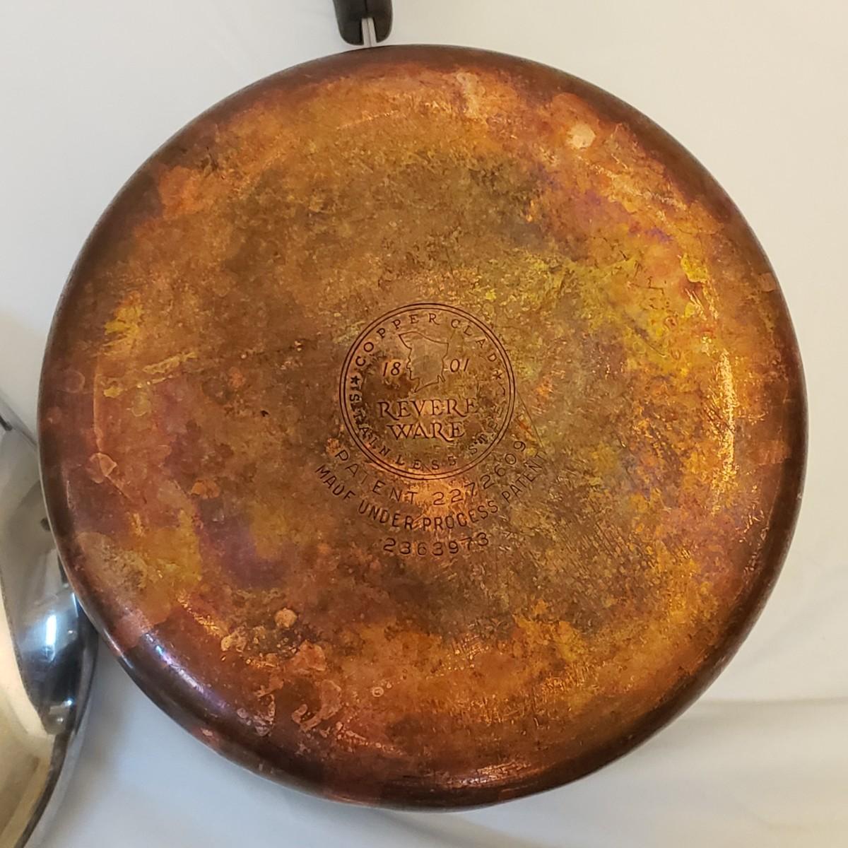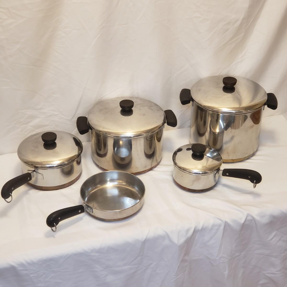 This is a 5 piece Revere Ware stainless steel, copper clad cooking set of pots and pans. The lot contains an 8 quart stock pot with lid, 4 1/2 quart Dutch Oven with lid, a 2 quart sauce pan with lid, a 1 quart sauce pan with lid and a 7 inch skillet.