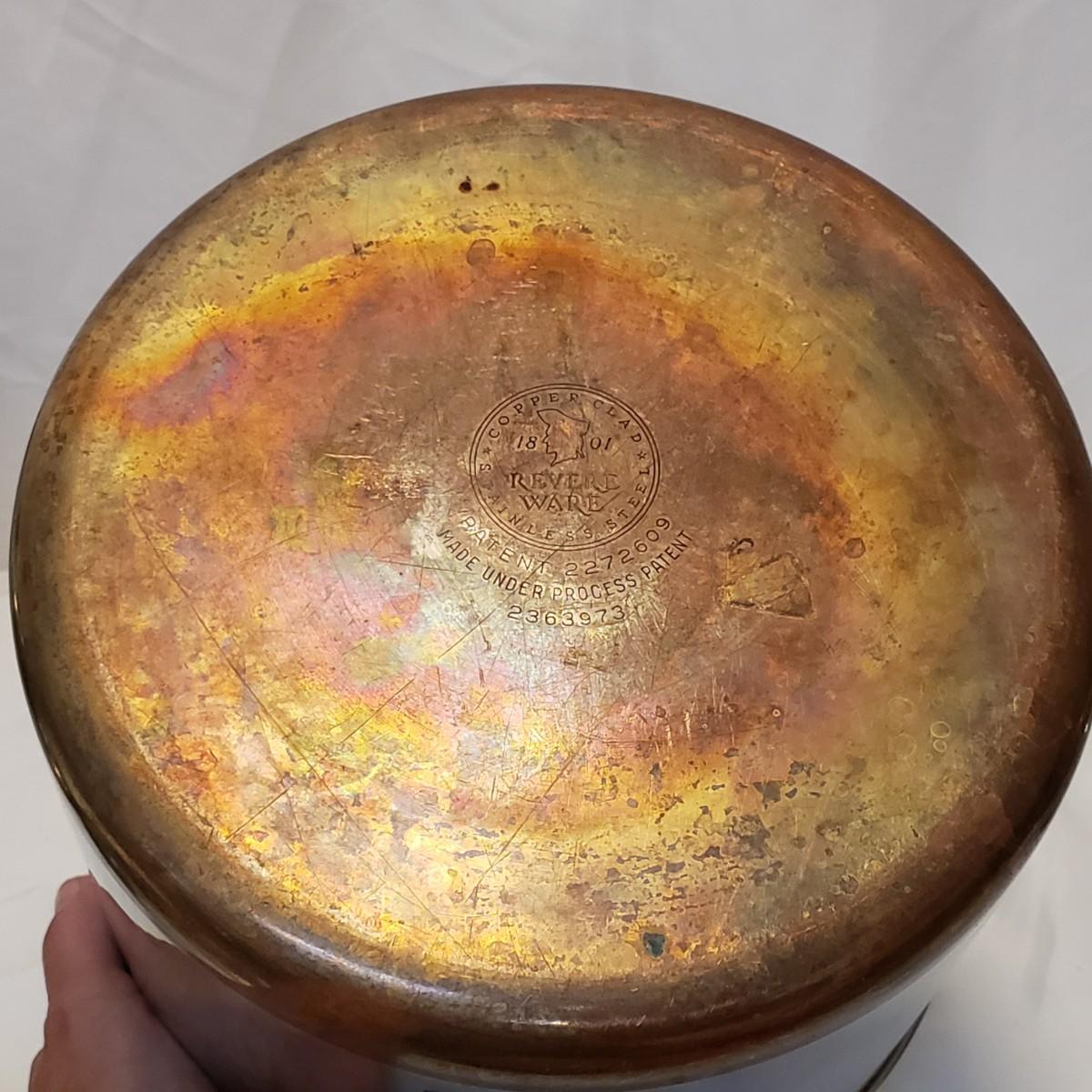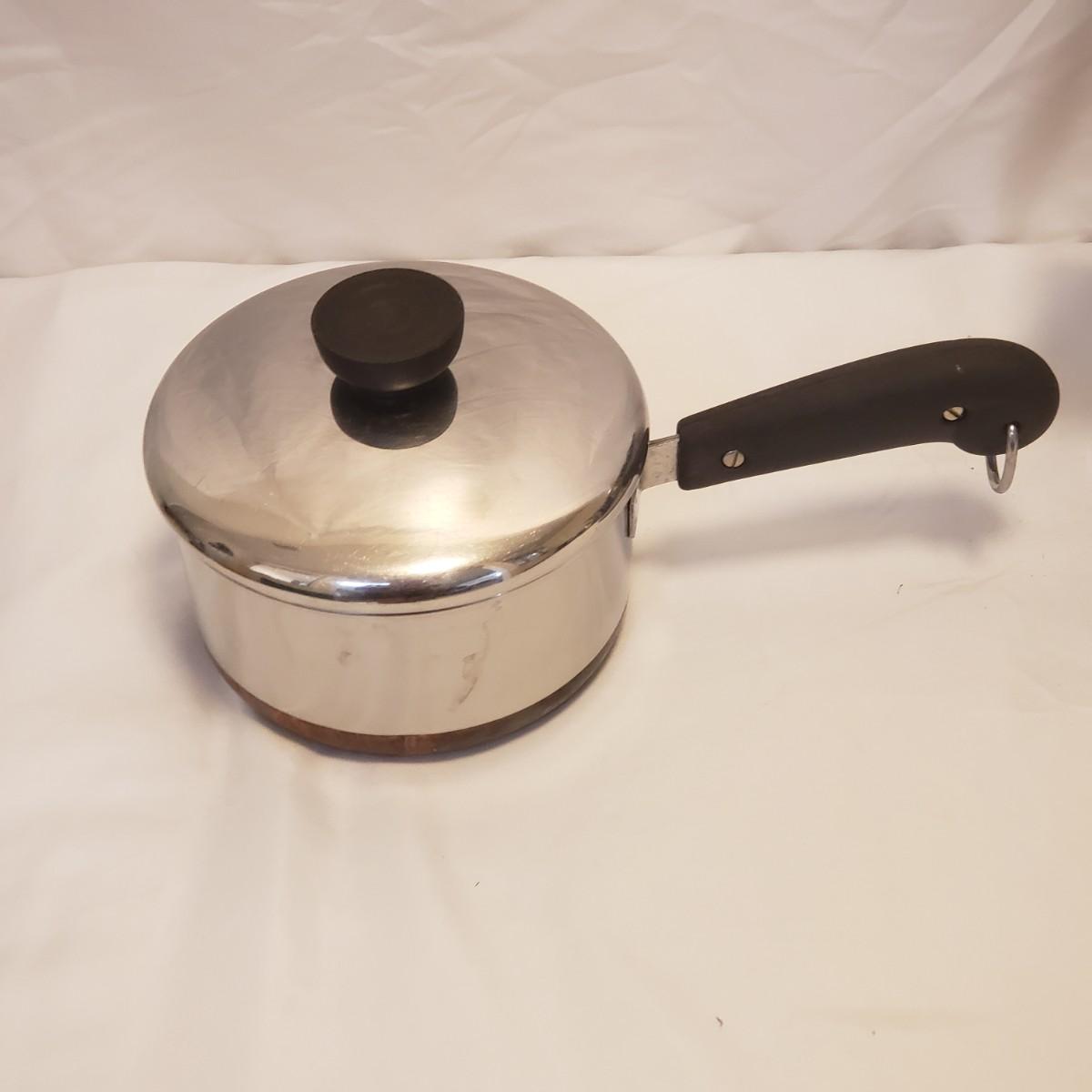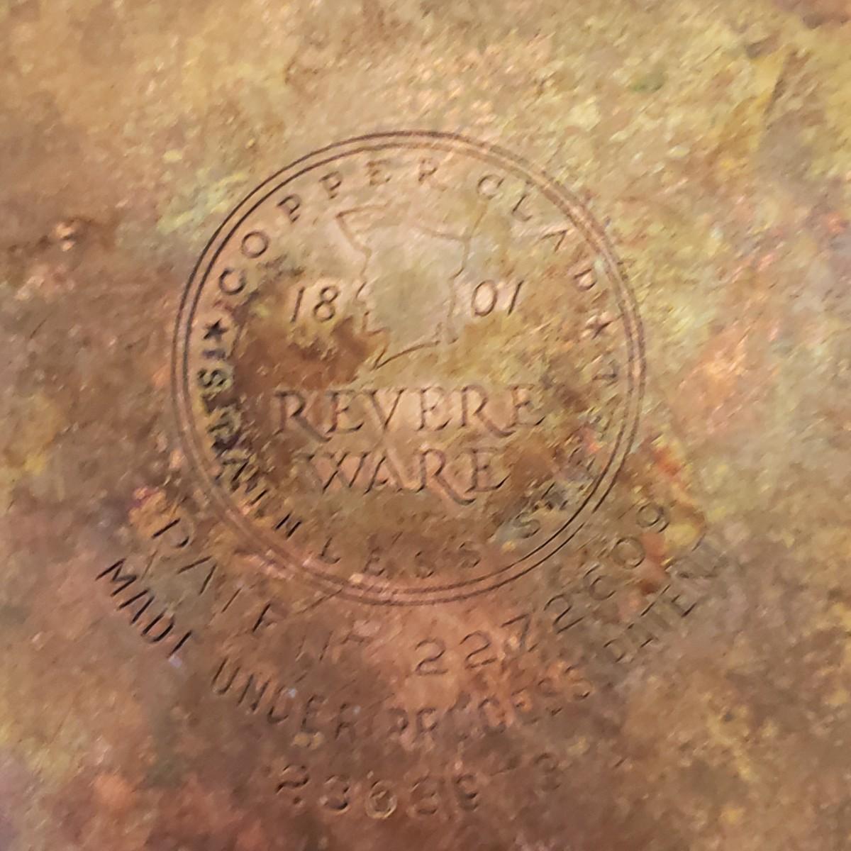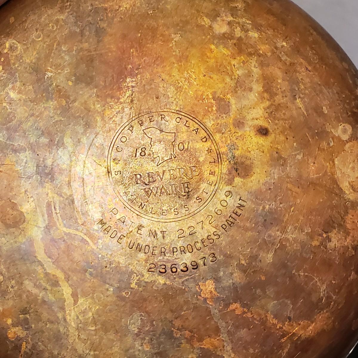 This is a 5 piece Revere Ware stainless steel, copper clad cooking set of pots and pans. The lot contains an 8 quart stock pot with lid, 4 1/2 quart Dutch Oven with lid, a 2 quart sauce pan with lid, a 1 quart sauce pan with lid and a 7 inch skillet.