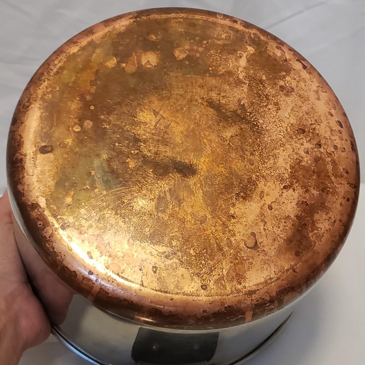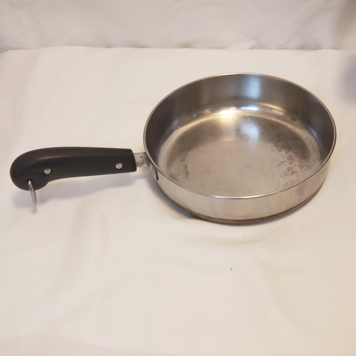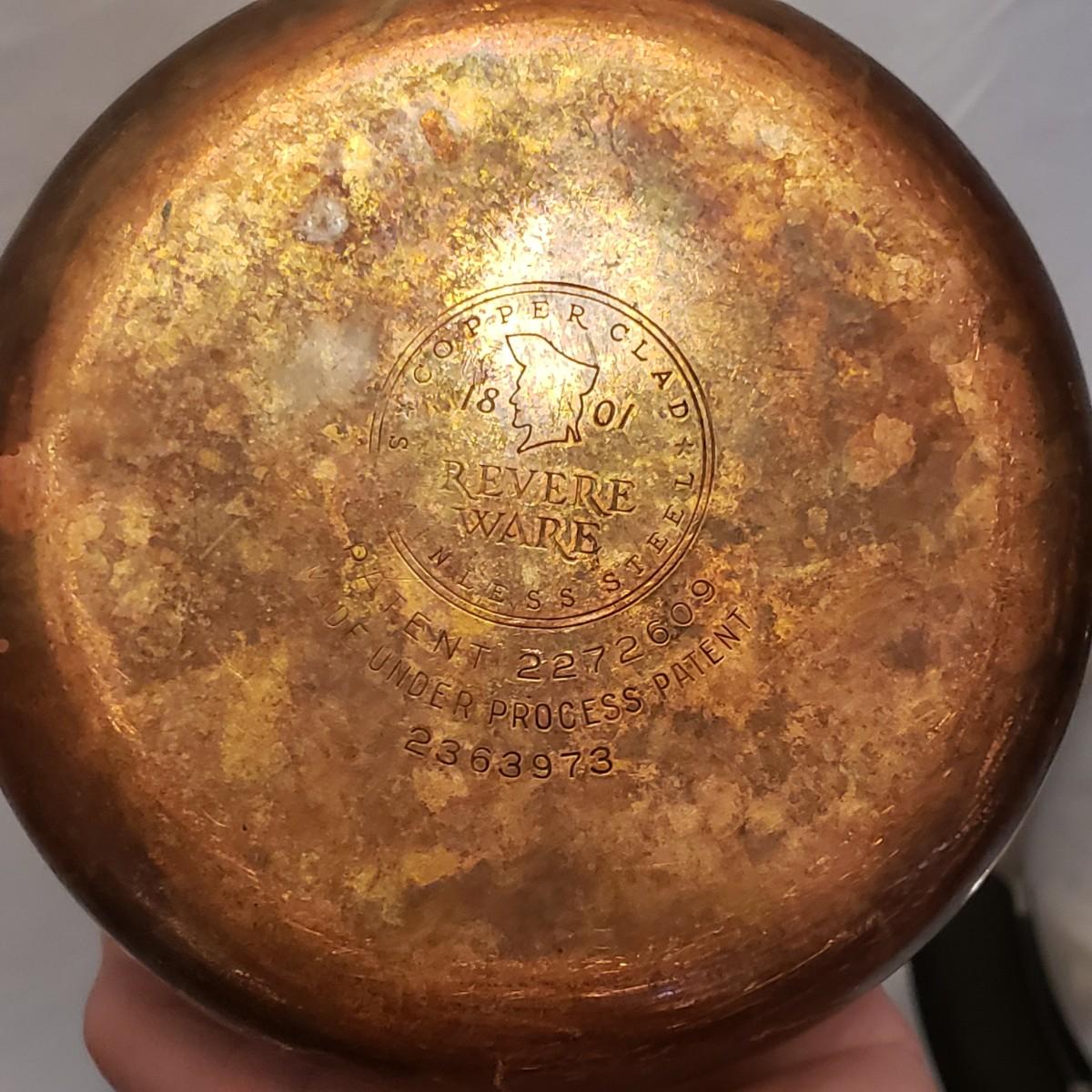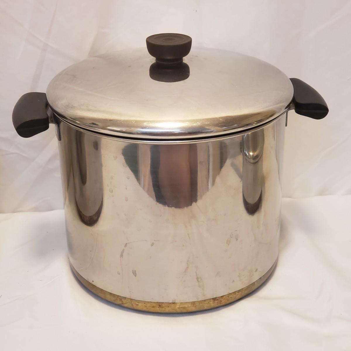 This is a 5 piece Revere Ware stainless steel, copper clad cooking set of pots and pans. The lot contains an 8 quart stock pot with lid, 4 1/2 quart Dutch Oven with lid, a 2 quart sauce pan with lid, a 1 quart sauce pan with lid and a 7 inch skillet.