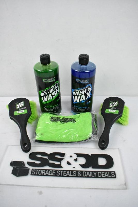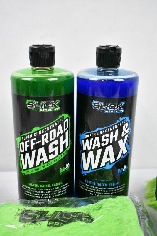 5 Piece Slick Products Car Cleaning: Off-Road Wash 32 oz, Wash & Wax 32 oz, Cloths, Brushes - New