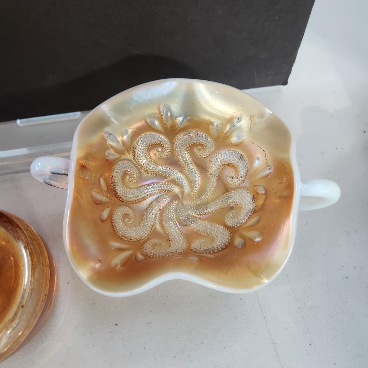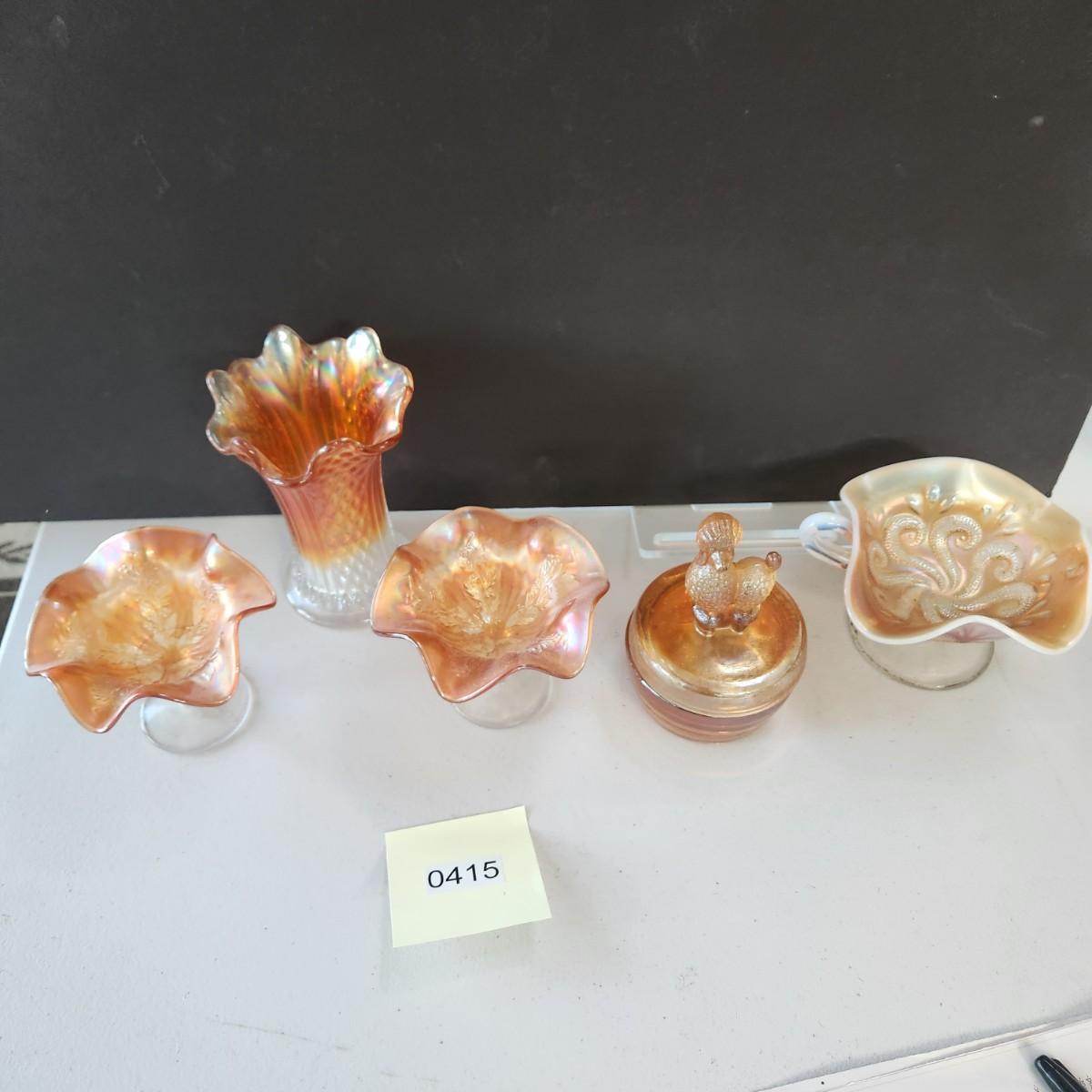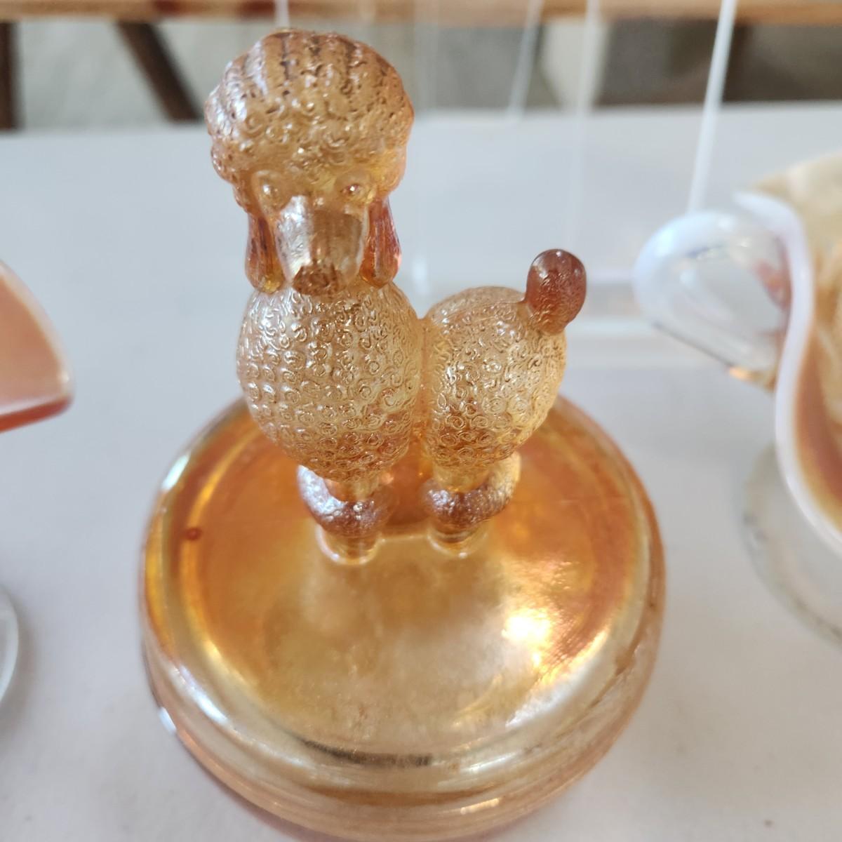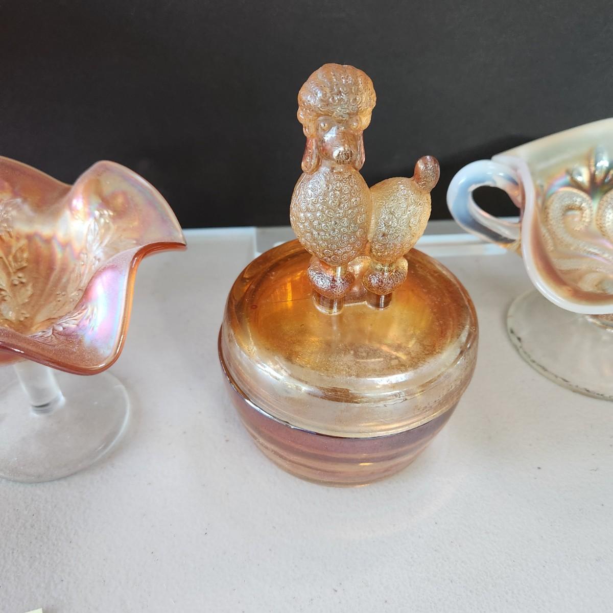 5 Pieces Carnival Glass Dishes ,Vase , Poodle dog Cover bowl