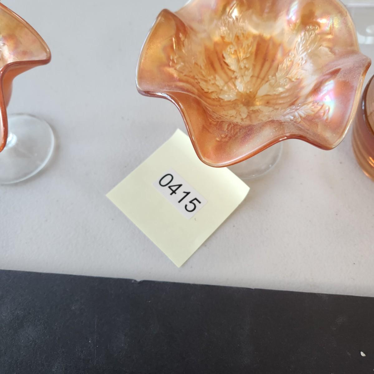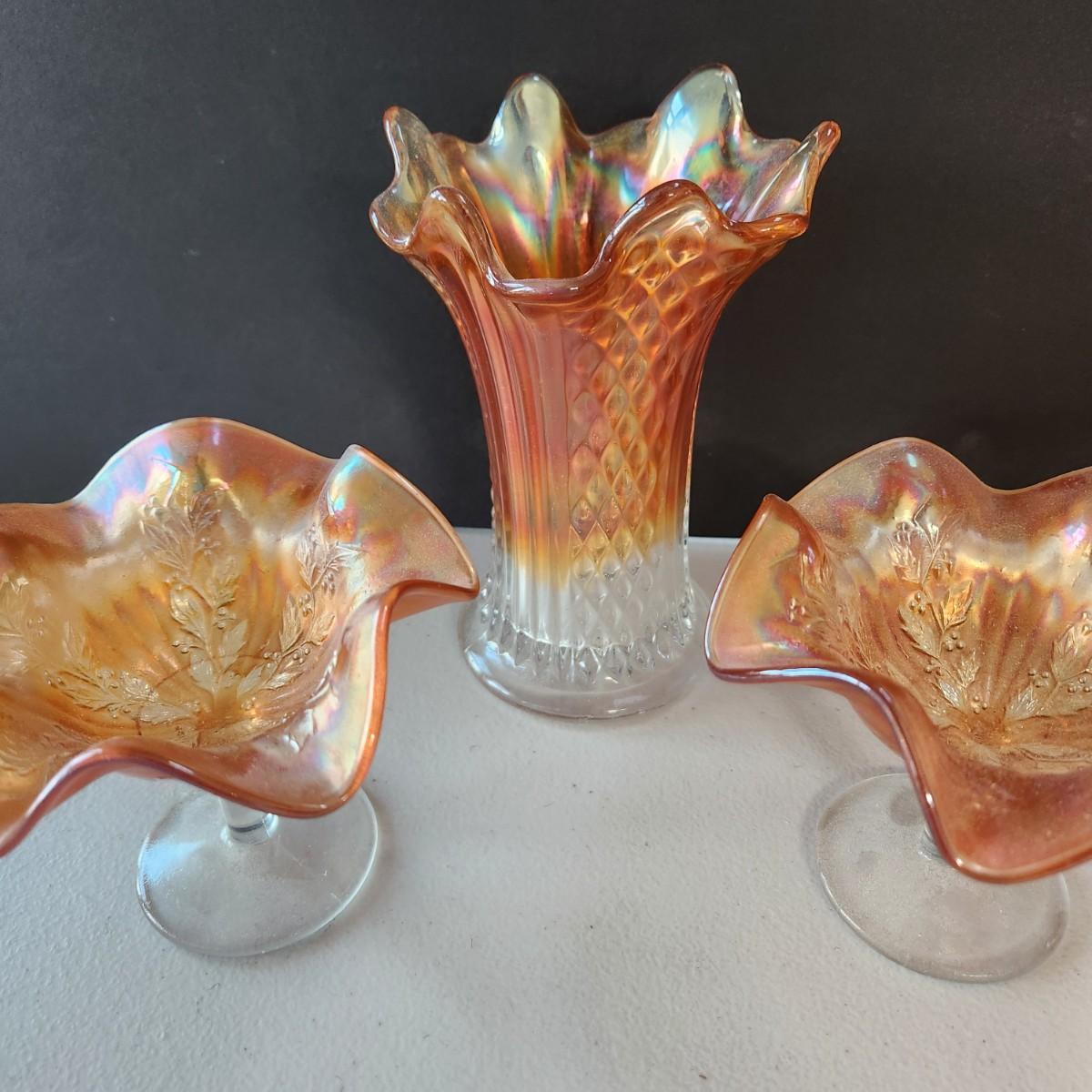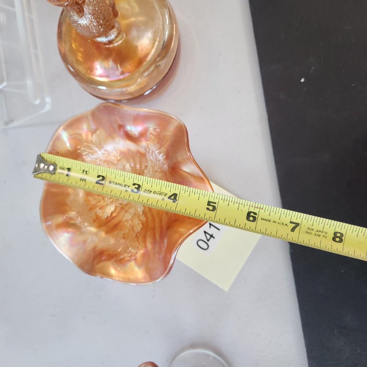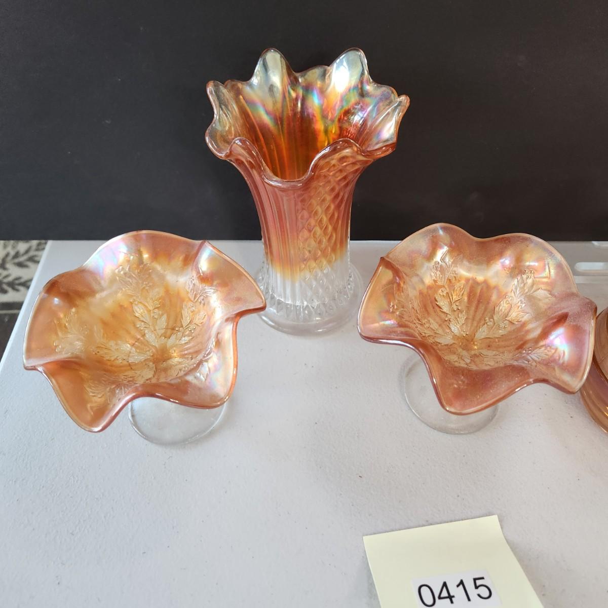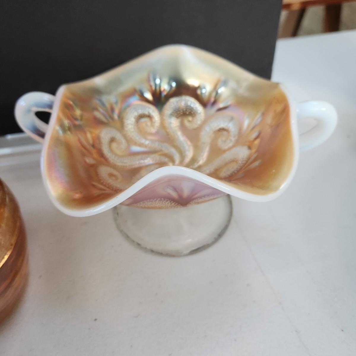 5 Pieces Carnival Glass Dishes ,Vase , Poodle dog Cover bowl