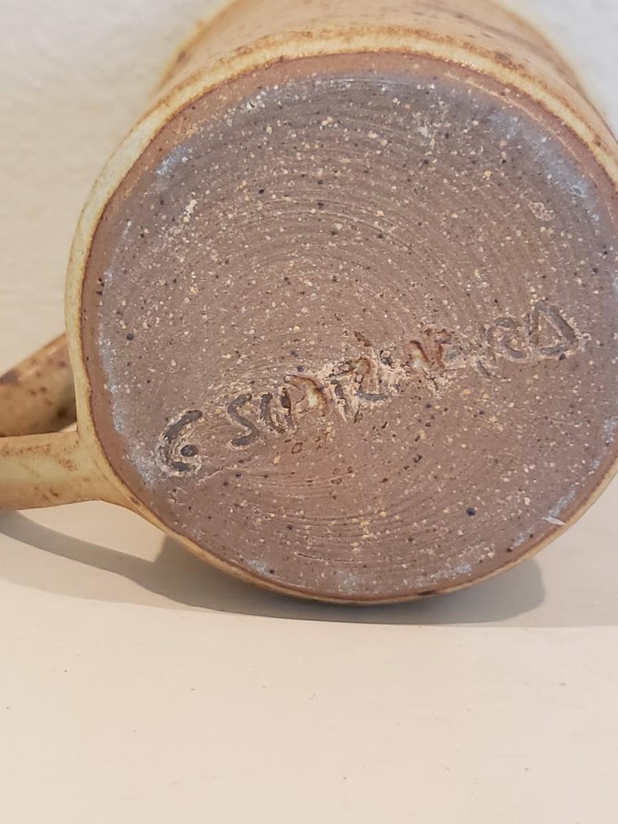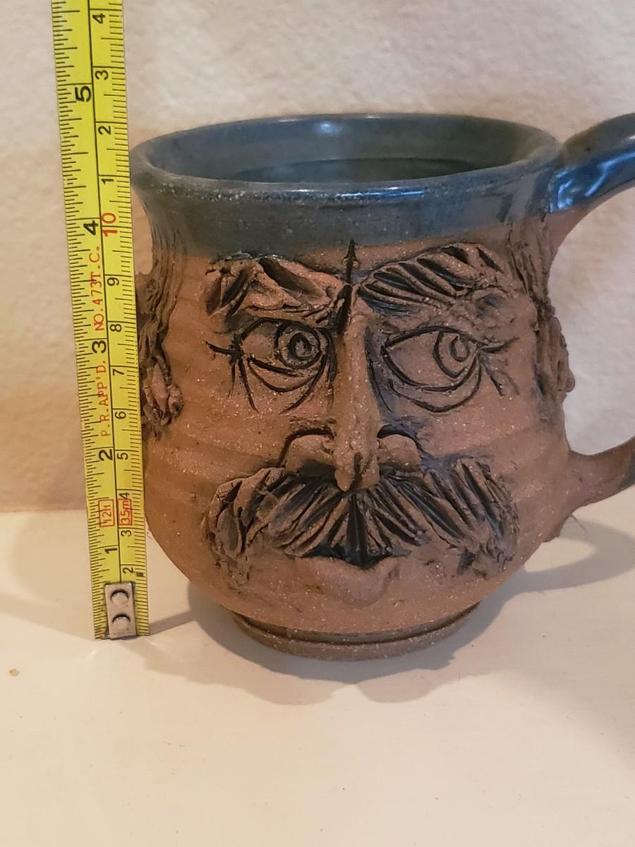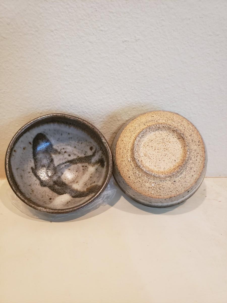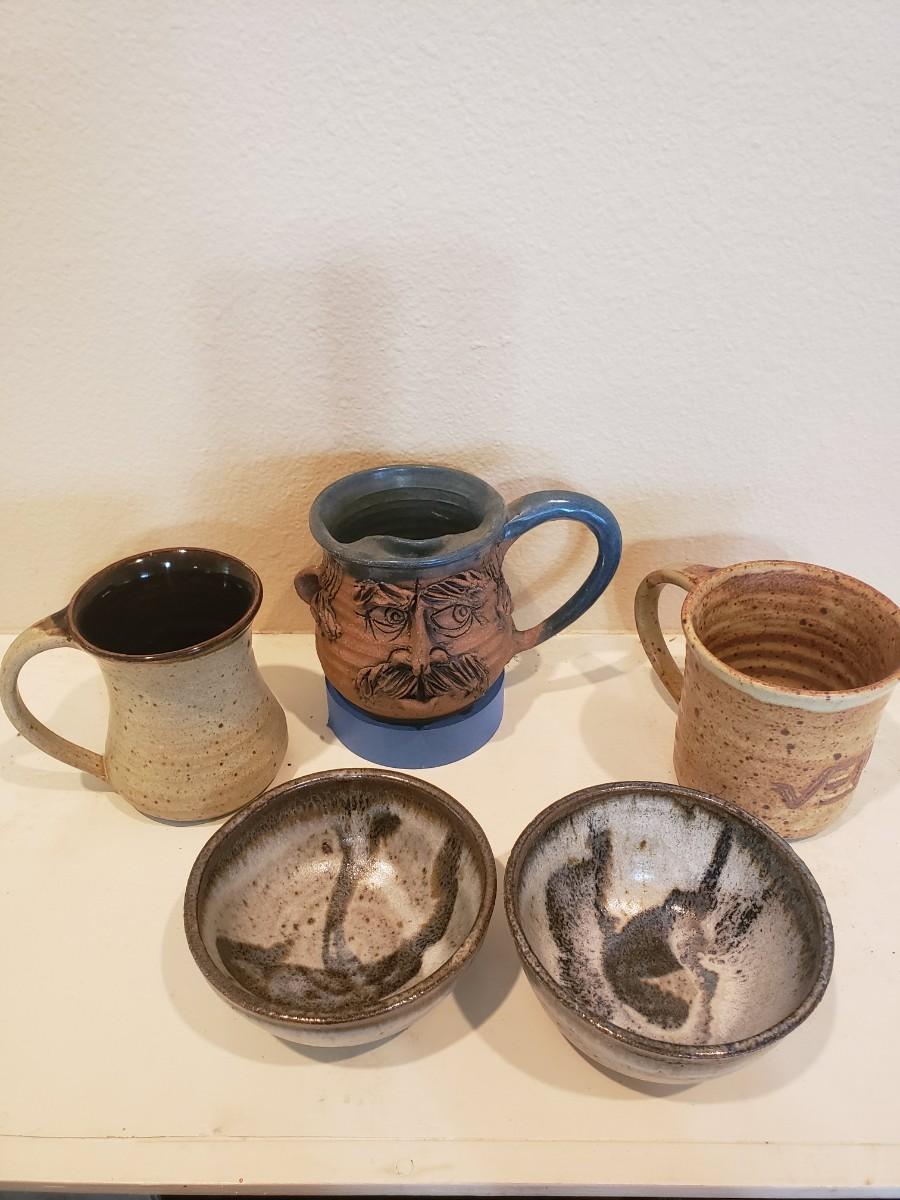 Lot of 5 studio pottery pieces. 2 small bowls, 2 signed coffee mugs, and one vintage face mug.
