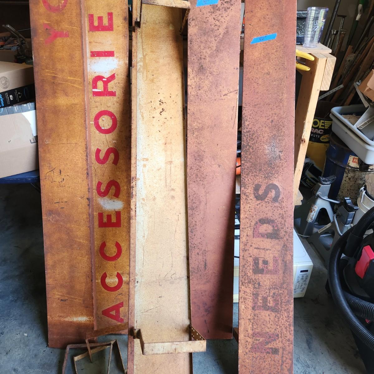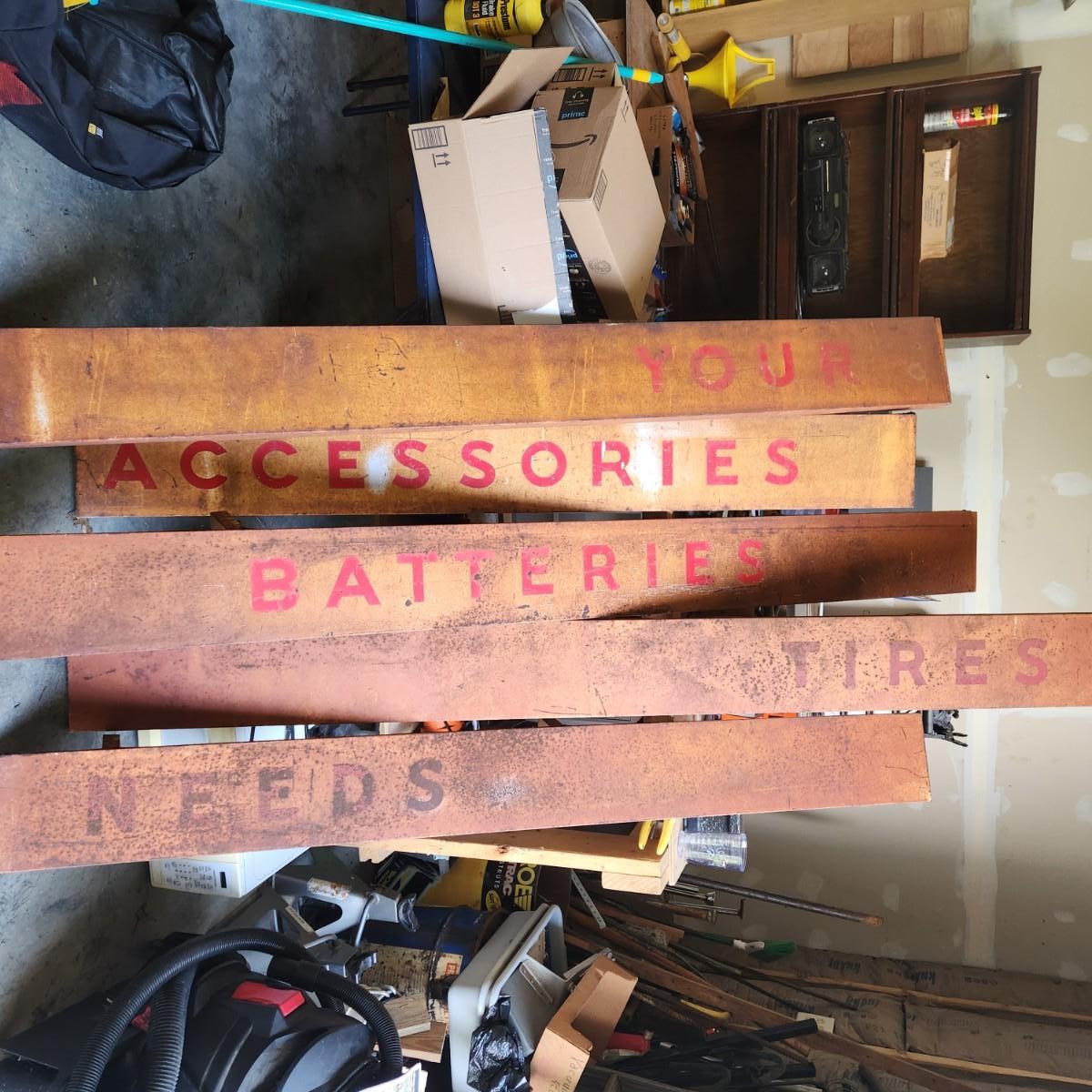 5 pieces Vintage Auto Store Metal Signs "Your Accessories Batteries Tire Needs" w Brackets 8.5" tall