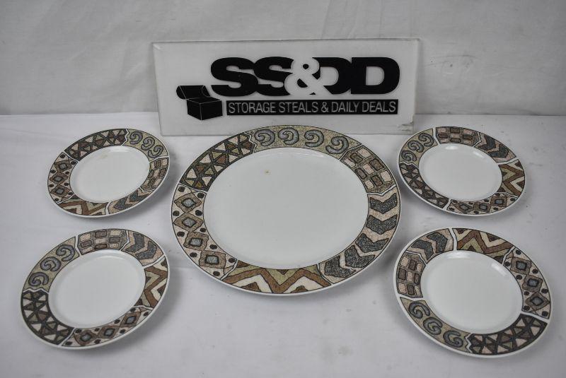 5 Plates: 1 large & 4 small Browns, Aztec Style